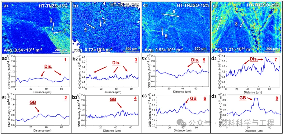 图8 (a1–b3) HT-TNZS和 (c1–d3) HT-TNZSO合金在15%和25%预拉伸应变下的几何必需位错分布和线扫曲线图;(a1-b1, c1-d1) 两种合金的GND分布;(a2-a3, b2-b3, c2-c3, d2-d3) 为沿位错和晶界的相应线扫曲线图