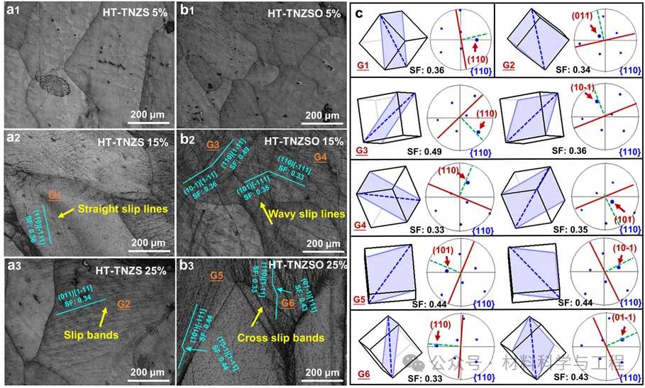 图7 HT-TNZS和HT-TNZSO合金在不同间断拉伸应变下的变形微观结构的EBSD表征。(a1–a3) HT-TNZS合金在5%、15%和25%预拉伸应变下的对比图像,(b1–b3) HT-TNZSO合金在5%、15%和25%预拉伸应变下的对比图像。(c) HT-TNZS和HT-TNZSO合金中具有滑移迹线的代表性晶粒(G1–G6) 的滑移系信息。晶粒取向以晶胞模型表示,其中浅蓝色阴影平面和深蓝色虚线分别代表激活的滑移面和滑移方向。{110} 极图中的红线平行于滑移迹线,绿色虚线用于确定极图中滑移迹线的对应米勒指数