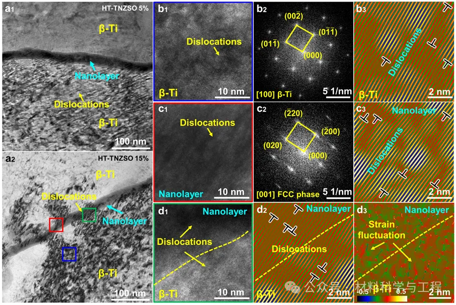 图10 拉伸试验后HT-TNZSO合金晶界附近微观结构演变的TEM表征。(a1) 5%应变和 (a2) 15%应变下晶界附近的微观结构特征。(b1) 图(a2)中蓝色方框区域的HRTEM图像,显示β-Ti中的位错构型;(b2) 图(b1)的FFT图像,显示沿[100] β-Ti晶带轴的β-Ti基体;(b3) 沿(011)晶面的β-Ti基体晶格条纹重构。(c1) 图(a2)中红色方框区域的HRTEM图像,显示纳米层内部的位错构型;(c2) 图(c1)的FFT图像,显示沿[001] FCC晶带轴的界面纳米层;(c3)沿(020)晶面的界面纳米层的晶格条纹重构。(d1) 图(a2)中绿色方框区域的HRTEM图像,显示了纳米层与β-Ti基体之间的界面;(d2)晶格条纹重构,显示了位错跨越纳米层与β-Ti基体之间的边界的迁移;(d3) GPA分布,显示了纳米层-基体界面处的应变波动
