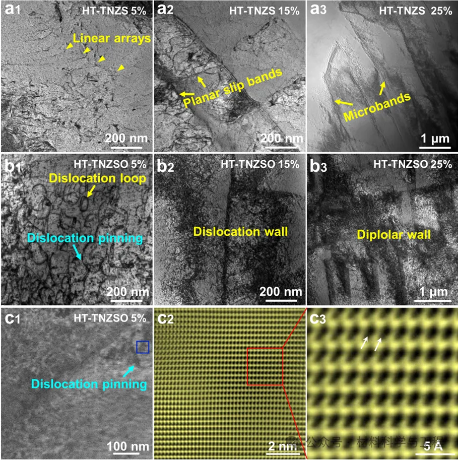 图9 不同拉伸应变下HT-TNZS和HT-TNZSO合金中位错构型的TEM分析。HT-TNZS合金在(a1) 5%、(a2) 10%和(a3) 25%应变下的位错构型;以及HT-TNZSO合金在(b1) 5%、(b2) 10%和(b3) 25%应变下的位错构型。(c1) 5%应变下HT-TNZSO合金的TEM显微结构;(c2) 位错钉扎点周围局部原子结构的原子分辨率STEM-ABF图像;(c3) 图(c2)中红色方框区域的放大图,其中白色箭头表示氧原子柱