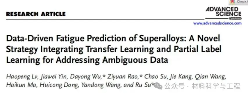 高温合金是航空航天、能源动力等国家重点领域关键装备的核心材料,其在高温高压环境下的性能预测是决定设备安全可靠性的核心指标。近年来,随着计算科学的迅猛发展,机器学习在预测高温合金性能方面取得了显著成就。例如,结合高通量实验和引入物理信息描述符的机器学习算法预测疲劳寿命,提高模型精度与解释性。然而,在材料研发与应用过程中,由于合金成分、热处理工艺等数据记录常常存在不完整或缺失的情况(即“模糊数据”),这严重制约了传统机器学习方法的预测能力。因此,如何基于这些不确定性的数据进行准确的性能预测,一直是该领域面临的一大挑战。 针对这一难题,河北科技大学苏孺教授团队联合上海交通大学、北京科技大学学者创新性地将两种机器学习技术—“迁移学习”与“部分标签学习”相结合,构建了一个能够高效处理数据不确定性的预测框架。该框架能够利用从相关材料体系中学到的通用知识,来智能地补全和修正当前数据集中缺失或模糊的关键信息。通过这一策略,该框架成功实现了从不完整的初始数据中精确“提炼”出高温合金的真实组成,基于被该框架“修正与增强”的数据,疲劳性能预测模型的准确性和泛化能力均得到了显著提升。 相关工作以题为“Data-driven fatigue prediction of superalloys: a novel strategy integrating transfer learning and partial label learning for addressing ambiguous data”研究性论文发表在《Advanced Science》。河北科技大学博士研究生吕浩鹏为论文第一作者,河北科技大学吴大勇副教授、苏孺教授、上海交通大学饶梓元副教授为论文的通讯作者。该研究成果为解决材料科学领域普遍存在的“小数据、不完整数据”问题提供了新的思路,在高性能合金的设计、服役可靠性评估等方面具有指导意义和应用前景。 论文链接: 图1. 方法论概述。a) 结合PLL与TL进行合金成分挖掘与疲劳性能预测的新型工作流程框架。该框架分为四个主要步骤:(I) 拉伸性能与成分预测;(II) TL方法;(III) PLL方法;(IV) 疲劳性能预测。b) 模型预测疲劳性能准确性的实验验证。具体步骤包括材料制备、疲劳试验、数据采集及模型验证。 图2. PLL流程图:a) 数据消歧过程示意图及每次优化循环后失效数据的演变过程;b)模型在优化周期中MAPE与R²值的变化趋势;c) 应用PLL策略前后SVR模型MAPE与R²值的对比。