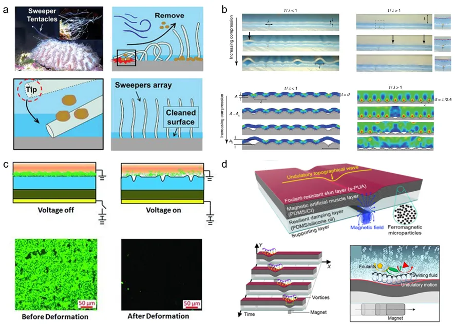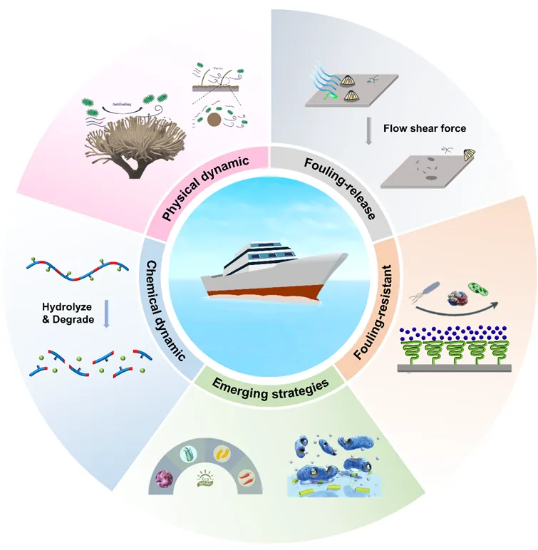 随着陆地资源的日趋减少,海洋资源的开发与利用已成为许多海洋国家的重要发展战略。然而,在海洋开发进程中,远洋船舶、海上平台、核电站、海洋牧场等不可避免地会遇到海洋生物污损问题,它是指海洋微生物、动植物在海洋装备与设施表面粘附、生长所形成的生物垢,其会降低船舶航行速度,加速海洋装备腐蚀,堵塞海水冷却管路,影响海洋养殖产量等,从而对海洋工业造成深刻影响。由于海洋环境复杂严苛、污损生物种类多样、环保法规日益严格,海洋防污一直是国际性难题,特别是静态、长效、生态友好防污,极具挑战性。长期以来,国内外开发了多种防污策略来应对海洋污损挑战,包括防污涂层法,机械清洗法、电解海水或超声波处理法等。其中,使用防污涂层是目前最经济、有效、简便的方法。传统型防污涂层是利用材料中释放的防污剂如铜类化合物等来杀灭污损生物,尽管有效,但它们会带来环境和生态风险。因此,研究开发环境友好海洋防污体系十分重要。华南理工大学海洋工程材料团队长期从事海洋先进防护高分子材料研究。借助于高分子材料创新设计,先后研制了针对船体、螺旋桨以及内海水系统的系列防污材料,相关技术已在各类船舶、海洋能源装备等规模化应用(Adv. Mater.2025, 37, 2413035; Adv. Funct. Mater.2025, e25696; Adv. Funct. Mater.2025, 35, 2508400; Prog. Polym. Sci.2024, 154, 101840; Acc. Chem. Res.2022, 55, 1586)。最近,该团队系统总结了海洋防污高分子材料及其界面设计的最新进展,包括化学动态表面防污材料、物理动态表面防污材料、污损脱附型防污材料、污损阻抗型防污材料和其它新兴防污材料等。“动态表面防污”策略是指不断发生化学或物理变化的表面可有效抑制污损生物的附着,表面变化越快,污损生物越少。项目团队首先利用自行搭建的数字全息显微镜,研究了可降解高分子涂层与海水界面附近海洋细菌的三维运动行为,证明了涂层表面降解(变化)速度越高,细菌越趋向于远离表面运动,在涂层表面粘附越少。该策略明确了动态表面对防污材料的重要性及必要性,为高性能防污材料的设计指明了方向,开辟了海洋防污的新路径。由此,衍生出化学动态表面防污材料和物理动态表面防污材料。化学动态表面防污材料主要基于高分子可控降解反应实现,包括主链降解型、主链降解—侧链水解型(双解)以及最新一代的超支化双解型高分子基防污材料。它们在海洋环境中能形成可控的自更新“动态表面”,通过对降解速率、释放速率等因素的调控,可实现静态、长效、生态友好防污。物理动态表面防污材料主要基于外部刺激下产生不稳定或可变形的界面实现,它们不仅使污损生物更难粘附,而且通过动态变形可促进已经附着在表面的污损生物脱附。目前外源性刺激如电场或磁场已被用于制备动态表面防污材料,也得到很好的验证。但如何根据在航装备或者海上平台的服役特点设计制备物理动态表面防污材料,将具有更广泛的适用性。污损脱附型防污材料是指与污损生物间粘附强度较弱的材料,通过水流冲刷或机械清除等物理作用即可达到防污目的。目前以柔性有机硅弹性体为主,其核心为低表面能、高弹性、表面光滑等,使得污损生物不易于粘附或附着不牢。然而它们通常存在力学强度低、与基底附着力弱、静态防污能力差等问题。基于“刚柔并济”策略,通过有机-无机杂化方式将线型聚二甲基硅氧烷网络发展为体型聚硅氧烷高度交联网络,从而制备高强韧“聚合物陶瓷”涂层,是污损脱附型防污材料发展的重要方向。该材料兼具有聚合物和陶瓷的性质(即柔性陶瓷),表现出高硬度、高附着力、耐磨性,在保持污损脱附性能的同时,可引入污损阻抗基团,并拓展到抗油、抗垢、抗冰等。进一步还可引入自修复或可回收功能,有望成为下一代海洋防污涂层。污损阻抗型防污材料是指可抑制、阻止海生物附着生长的材料,通常为亲水性高分子,其表面可形成一层水化层,当生物靠近时要突破水化层才能与基体表面粘结,这就导致需要更多能量,因此降低了粘附的可能性。这类材料主要包括聚乙二醇、两性离子聚合物和水凝胶等,对蛋白质、海洋细菌、绿藻孢子和藤壶幼虫等的阻抗能力良好。然而,对于具有水化层的防污材料,如何实现亲水性和力学强度之间的平衡仍然具有挑战性。自生成两性离子聚合物与表面自富集策略等的出现提供了潜在解决方案。对于其它类型的污损阻抗策略,如蛋白质基涂层和带电涂层,它们在海洋环境中的长期有效性还需要进一步研究。除了以上防污材料外,新兴的防污策略(如天然防污剂、酶防污剂、紫外线照射)也在积极探索中。这些新兴方法旨在为海洋防污提供环境友好、经济高效和可扩展的解决方案。然后,这些新兴策略也需要新型高分子材料相互协同,例如要解决天然防污剂或酶防污剂在防污体系中的相容性、活性和可控释放,这就需要高分子材料的创新设计来实现。综上所述,本文重点讨论了海洋防污高分子材料结构与性能之间的关系,然后探讨了当前海洋防污面临的挑战,并提出了可能解决方案。展望未来,海洋防污技术的趋势和重点是生态友好、长效、广谱、智能化。这需要多领域的交叉研究,如防污手段与智能检测的融合、防污材料与深度学习的融合等。该综述旨在为读者提供对海洋防污高分子材料和界