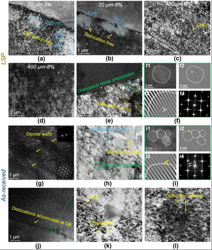 图9.拉伸变形后LSP状态(a-f)和接收态(g-l)样品的TEM表征。(a)3%拉伸应变后,表面下的深度为20 μm。(b)在相同深度(120 μm)下,经过8%的拉伸应变后,显示出粗化的无位错胞状结构。(c)经过3%的应变后,深度为1400 μm。(d,e)经过8%的应变后,深度为1400 μ m。在(e)中,绿色框突出了位错和沉淀物之间的相互作用,其在(f1-f4)中进一步分析。(f1)(e)中的方框区域的高分辨率HAADF-STEM图像。(f2)(f1)的快速傅立叶逆变换(IFFT),(f4)(f1)的相应FFT分析。(g-l)在8%拉伸应变后,原样样品的晶粒和GB位置处的不同尺度的TEM表征。(g,h)是在<110>Al区轴下获得的,g =(002)。所有其他TEM图像都是在相同的双光束条件下获得的,即入射光束平行于<110>Al区轴,g =(111)。