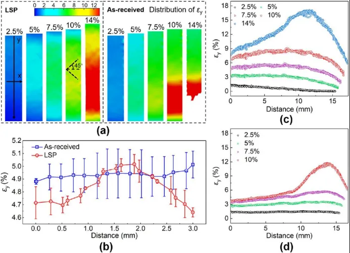 图7.试样横截面的DIC分析。(a)横截面上εy(沿着拉伸方向,y方向的应变)的应变等值线图。(B)沿着厚度方向(x方向)的εy的线形。(c)LSP状态试样沿着拉伸方向的εy分布。(d)接收态试样沿着拉伸方向的εy分布。
