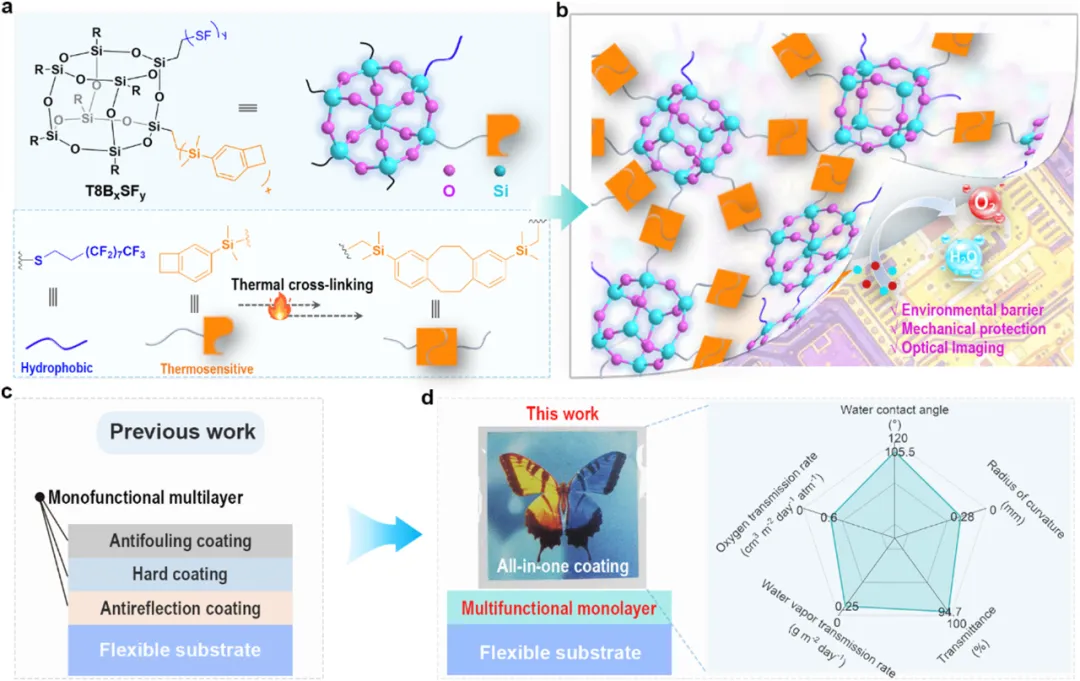近期,上海交通大学路庆华团队采用分子预编程策略,成功制备了一种具有硬度、柔韧性、水/氧阻隔性能和抗反射性能的多功能POSS涂层。