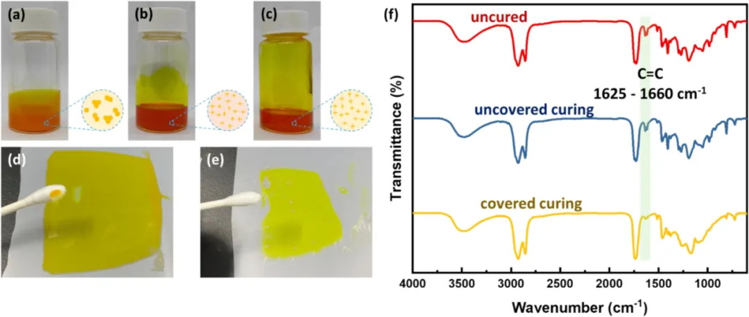 首先将姜黄素(CCM)溶解在丙酮中,与丙烯酸酯化环氧大豆油(AESO)混合,去除溶剂后得到AESO/CCM树脂混合物,然后添加甘油(GLY)或1,6-己二甲醇(HDT)制得光固化涂层树脂;通过刮涂法涂覆光固化涂层树脂,在覆盖脱模膜,随后进行UV固化,获得防水涂层。 研究表明,采用硫醇作为共引发剂制得涂层的自由基生成率比甘油体系高66%,光聚合效率显著提高。该涂层能够在30分钟内实现完全交联,凝胶分数超过99%,T10%达到317.1°C,凝胶分数和热稳定性与使用商业TPO固化相当。这些结果证实了本研究开发的生物基PIS具有优异的光固化性能。该涂层具有高度的生物相容性,细胞存活率为93%。当应用于各种基材时,该涂层显著提高了表面疏水稳定性,在16分钟内水接触角仅降低了7-8度。此外,该涂层还具有优异的防水和抗墨性能。 本研究可大规模应用且对环境友好,为绿色防水材料的开发提供了一种创新且有前景的解决方案,在下一代表面工程中具有广泛应用的潜力。 光固化树脂照片 不同混合路线制备的1wt% CCM光固化树脂的照片:(a)直接混合,(b)与共溶剂混合,(c)去除共溶剂后;(d)无覆盖和(e)有覆盖UV固化薄膜照片;(f)薄膜的FTIR光谱。 抗墨性 不同基材上抗墨性在涂层前后的对比。 数据来源与出处 相关研究成果以“Bio-derived photocurable resin for water resistant coatings”为标题发表在《Progress in Organic Coatings》上。