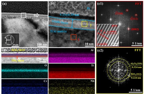 图1、Ti4822合金粉末的TEM分析:(a) 氧化膜的TEM形貌;(b) 氧化膜的高分辨形貌;(c1) 粉末基体的傅里叶变化及反傅里叶变化图谱;(c2) 氧化膜的傅里叶变化图谱;(d) 元素分布图。