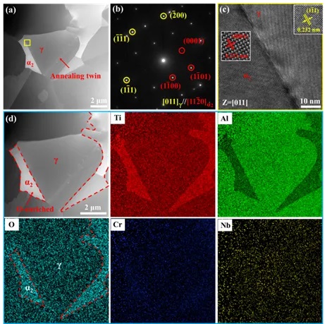 图3、纯Ti4822合金的STEM分析:(a-c) STEM形貌图及对应区域的SAED图和HRTEM图;(d) 元素面扫分布图。