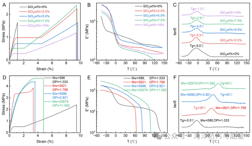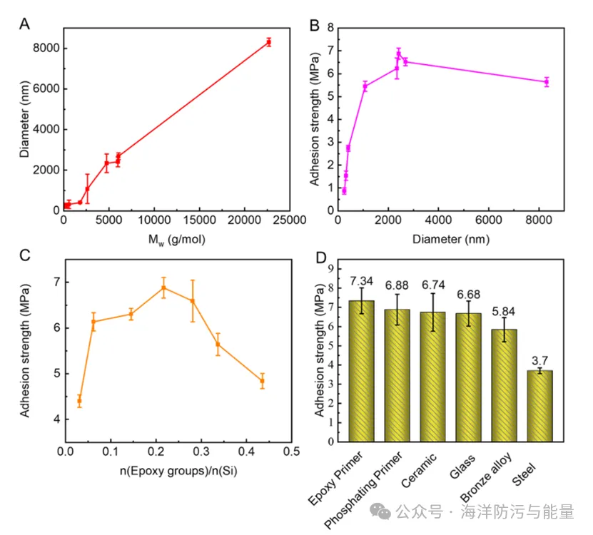 涂层的制备: 将MPDMS(0.07mol,12.74g)、DMES(0.03 mol,4.44g)、KH560(0.04mol,9.44g)和TEOS(0.0446 mol, 7.94 g)在三颈烧瓶(250 mL)中混合。随后,将SiO2NPs(2.6g)和四 甲基氢氧化铵(0.1mL)共同添加到烧瓶中后,在连续搅拌下逐滴添加去离子水(90mL)。逐渐升温至80°C,搅拌24h,再升温至135°C,搅拌4h,使催化剂热解,蒸馏除去体系中的水。最后,将反应冷却至室温,得到透明粘稠液体,命名为PEMPS。 PEMPS和APTES的细致缩合反应配制而成的聚硅氧烷涂层被命名为PEMPSc。在典型的制备中,PEMPS (10.0g)和 APTES (2.5g)溶解在丁醇中,并使用磁力搅拌器充分混合15分钟。随后,通过喷涂将PEMPSc涂层涂覆到各种基材上。然后使涂覆的基材在室温下固化2小时,从而形成纳米复合材料涂层。 方案1. 步骤1)合成环氧聚硅氧烷纳米胶束的示意图,步骤2)交联过程的示意图,步骤3)PEMPSc的多功能 PEMPS的表征: PEMPS是通过水滴定乳液聚合技术合成的,其化学成分通过图1和2所示的1H NMR和FTIR分析进行了验证。分别如图1A和1B所示。1H NMR 谱(图1A)在 0.014ppm (a) 和 0.31ppm (c) 处显示出明显的峰,表明 Si‐Me 基团内存在‐CH3部分。此外,0.087ppm(b)、1.62–1.42ppm(d)、2.05 ppm(e)、3.67ppm (f) 和4.7ppm (g)处的峰对应于环氧丙基中的‐CH2‐和‐CH‐片段,而7.44–7.41 ppm (h)和 7.64 ppm 处的峰对应(i)归因于苯基。PEMPS的FTIR光谱(图1B)以及KH560、MPDMS、DMES和TEOS的FTIR光谱显示了几个特征峰,进一步验证了其成功合成。3070至3800cm-1之间的宽峰带表示PEMPS中存在的‐OH、C‐O‐C‐和环氧基团的伸缩振动。830cm-1处的弱峰对应于环氧基团的弯曲振动。此外,2960、2870和1380cm-1处的峰代表Si‐Me键的伸缩振动,而2930、2850和1465cm-1 处的峰则与‐CH2‐基团相关。PEMPS的Si‐Ph伸缩峰在3070、1600和 1500cm-1处很明显。C‐O‐C对称拉伸峰出现在1103cm-1处,跨越1000‐1100cm-1的宽峰带表明PEMPS中的Si‐O‐Si弯曲峰。这些光谱特征证实了PEMPS的成功合成。 图1.A)PEMPS的1H核磁共振 B)PEMPS的红外透射光谱 附着力测试: 图2阐明了分子量与其对PEMPS颗粒尺寸以及涂层附着力的影响之间复杂的相互作用。当分子量(Mw)在约300至6000g/mol范围内时,附着力表现出正比关系,PEMPS对环氧底漆的附着强度0.87±0.13MPa上升至7.34±0.18MPa,比PDMS提高了十倍。然而,观察到了一个阈值,超过该阈值,过高的分子量会略微降低粘附力。与此同时,分子量的增加不可避免地导致聚硅氧烷胶束粒径的增大,如图2B所示;粒径对涂层的影响如图1A所示。 聚硅氧烷具有最高的分子量,并形成初始的高强度网络,分子量似乎可以根据粘合‐内聚平衡显示最佳位置。低于Mw ≈ 5996g/mol,没有足够的内聚力来产生最强的粘附力。当超过Mw≈6060g/mol时,内聚力的增加是以表面粘合相互作用为代价的。图2C揭示了环氧基含量与聚硅氧烷涂层附着力之间的抛物线关系,在环氧基含量为0.23(M/M)时峰值为6.88MPa。粘合强度的增强可能归因于环氧基团和极性基材之间氢键的形成。随着环氧基团数量的增加,PEMPS的扩散能力逐渐减弱,导致粘合强度和内聚力均失效。 图2D进一步强调了PEMPS在不同基材上的卓越粘合强度,包括环氧底漆(~7.34MPa)、磷化底漆(~6.88MPa)、陶瓷(~6.74MPa)、玻璃 (~6.68MPa)、青铜合金(~5.84MPa)和钢(~3.7MPa)。除了氢键外,涂层不仅可能通过PEMPSc的环氧基团与环氧底漆、磷化底漆、 陶瓷或玻璃上的羟基之间的反应以共价键结合到基材上,而且还增强了与基材的相互渗透,产生机械互锁结构,进一步增强了附着强度。对于青铜合金,由于Cu和环氧基团之间形成配位键,结合强度进一步提高。该涂层对钢的附着强度较低(~3.7MPa),因为PEMPSc和钢表面之间仅存在氢键。 图2.(A)PEMPS重量平均分子量与粒径的关系,PEMPS(B)和环氧基团(C)中粒径对涂层附着强度的影响,(D)PEMPSc在各种表面上的附着力表现 PEMPS既含有疏水基团(Si‐Me)又含有亲水基团(环氧基)。图3表示Si‐Me基团的比例增加,由于疏水元素的增加,表面能减小,但环氧基团产生了抵消影响,如图3B所示。通过巧妙地平衡这两个官能团的含量,聚硅氧烷涂层在强附着力和疏水性方面均表现出色。图3C显示PEMPSc上液滴的动态行为,水滴很容易从倾斜的涂层上滑落,表明涂层具有优异的防水性能。 图 3. PEMPSc 的 WCA、DCA 和表面能 (A,B),以及 PEMPSc 的防水性 (C) 不同SiO2NPs含量的样品拉伸性能的变化如图4A所示。与不含SiO2NPs的样品相比,复合PEMPSc涂层(SiO2NPs改性)的模量降低,而断裂伸长率和断裂强度增加。这表明SiO2NPs填充了微孔和缺陷,降低了涂层的内应力,从而提高了其韧性。当SiO2NPs含量增加到7.5 wt%时,样品的这些性能达到最佳状态。这可以归因于随着SiO2NPs含量的增加交联密度发生变化。纯的PEMPS和用SiO2NPsPEMPSc改性的储能模量如图4B所示。PEMPSc的玻璃化转变区域 (Tg) 发生在5和1.3°C之间 (图4C)。PEMPSc的储能模量随着SiO2NPs的加入而降低。这是因为聚硅氧烷分子之间的相互作用并未受到SiO2NPs掺入的影响,保持了分子链的活性,因此PEMPSc的Tg没有发生显着的改变。图4(D‐F)说明了不同相对分子量及其分布对涂层机械性能的影响。具体来说,当SiO2NPs含量为7.5wt%时,随着PEMPS分子量 (Mw) 的增加,观察到涂层的韧性、储能模量和Tg显着增强。这种现象源于PEMPS的Mw与其分子链之间的缠结密度之间的正比关系。 图 4. 聚硅氧烷涂层的动态力学分析:A‐C:SiO2NPs 含量的影响 D‐F:相对分子量及其分布的影响 图5封装了裸青铜、环氧底漆涂层青铜和PEMPSc/环