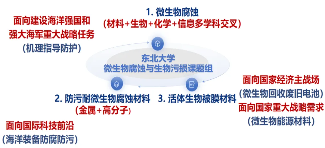 2025 年终工作总结报告 2025 东北大学腐蚀与防护中心微生物腐蚀与生物污损课题组是依托于王福会教授团队,由Derek Lovley教授领衔、徐大可教授负责,聚焦交叉学科建设,致力于服务国家重大战略需求,落实“四个面向”部署,是一支以服务国家经济与国防主战场为导向、瞄准世界科技前沿的科研团队。 团队拥有国家杰出青年科学基金获得者2人(王福会、徐大可)、国家级青年人才2人(张明星、周恩泽);中国博士后创新人才支持计划入选者2人(李祥宇、于智群)、中国科协资助青年托举人才1人(周恩泽)、博士后海外引才专项入选者1人(崔苗苗);辽宁省兴辽英才青年拔尖人才1人(范永强)、辽宁省青年科学基金B类2人(李中、李祥宇),形成了一支年轻(平均年龄34岁)、国际化(50%海外学历或访学和博后经历)、富有战斗力的高水平队伍,引领了国内和国际微生物腐蚀领域的发展。 “技”往开来,“微”来可期。 岁月不居,2025年在辛勤耕耘与团结协作中悄然走过。面对机遇与挑战并存的一年,东北大学微生物腐蚀与生物污损课题组始终秉持协同攻关的理念,持续推进科学创新与探索。 2025年课题组标志性成果如下: ① 周恩泽研究员入选国家级青年人才(建议人选); ② 李祥宇研究员荣获中国腐蚀与防护学会科学技术一等奖(拟授奖); ③ 李佳航同学获得东北大学材料科学与工程学院第一个国家自然科学基金青年学生基础研究项目(博士研究生); ④ 在 Advanced Materials,Angewandte Chemie International Edition,Advanced Functional Materials和Journal of Materials Science & Technology 等国际知名期刊发表论文17篇。 让我们共同回望这一年的足迹,凝练研究亮点,分享阶段性成果,并在此基础上展望未来,为课题组的持续发展勾勒更加清晰的蓝图。 获奖与课题立项 2025年,课题组聚焦微生物腐蚀与生物污损关键科学问题与工程需求,持续夯实研究基础、拓展应用场景,获得22个项目/基金支持,总经费超770万元,为前沿基础研究、人才梯队建设与学生创新能力提升赋能,不断注入活力。 获奖 李祥宇(1/11),于滨(3/11) 于智群(5/11),贺文岫(6/11) 荣获 中国腐蚀与防护学会科学技术奖 自然科学奖 一等奖 (拟授奖) 王迪(5/8) 荣获 中国腐蚀与防护学会科学技术奖 自然科学奖 一等奖 (拟授奖) 徐大可(5/8) 荣获 中国腐蚀与防护学会科学技术奖 科技进步奖 一等奖(拟授奖) 前沿基础研究 课题组以国家重大需求服役场景为牵引,系统推进机理研究,为后续防护策略与工程应用提供坚实理论支撑。2025年,在前沿基础研究方面,课题组获得国家重点研发项目课题1项,国家自然科学基金面上项目2项,青年科学基金项目(C类)1项,国自然基金委博士生项目1项,辽宁省青年科学基金B类项目1项,广东省联合基金项目1项,东北大学GF重大培育项目1项,辽宁省自然科学基金项目(博士启动项目)2项,中国博士后面上资助项目1项,校企合作项目1项,校级教改项目1项,东北大学博士生科研创新项目3项。 张明星 主持 国家重点研发项目课题 深海污损/腐蚀生物数据库 与污损/腐蚀机制研究 周恩泽 主持 国家自然科学基金面上项目 李祥宇 主持 ①国家自然科学基金面上项目 ②东北大学GF重大培育项目 李中 主持 ①广东省基础与应用基础 研究基金-海上风电联合基金项目 ②辽宁省青年科学基金(B)类项目 李嘉琦 主持 ①青年科学基金项目(C类) ②辽宁省自然科学基金项目 (博士启动项目) ③第78批中国博士后面上资助项目 王迪 主持 ①校企合作油田项目 ②校级教改项目 人才梯队建设 在科研任务稳步推进的同时,课题组进一步强化人才梯队布局,依托博士后、青年骨干及省部级人才类资助,持续完善团队结构。2025年,在人才梯队建设方面,课题组新增国家级青年人才1人,博士后海外引才专项计划1人次,中国博士后创新人才支持计划1人次,国家资助博士后研究人员计划1人次。 周恩泽 入选 国家级青年人才(建议人选) 崔苗苗 入选 博士后海外引才专项计划 于智群 入选 2025年度中国博士后 创新人才支持计划 刘赫 入选 国家资助博士后研究人员计划 (C档) 学生创新能力提升 课题组以各类博士生专项与创新计划为抓手,鼓励学生围绕前沿问题开展独立探索与交叉研究,推动学生在科研素养、创新意识与学术产出方面实现稳步提升。 李佳航同学获得东北大学材料科学与工程学院第一个国家自然科学基金青年学生基础研究项目(博士研究生),李佳航和杨琳琳同学入选中国科协青年科技人才培育工程博士生专项计划,标志着课题组人才培养进入高质量发展的新阶段。 李佳航 入选 中国科协青年科技人才 培育工程博士生专项计划 杨琳琳 入选 中国科协青年科技人才 培育工程博士生专项计划 李佳航 (导师:徐大可教授,周恩泽研究员) 主持 国自然基金委博士生项目 深海硫酸盐还原菌作用下 钛合金的氢脆机制研究 欧阳玺 (导师:徐大可教授,张明星教授) 主持 东北大学博士生科研创新项目 机器学习驱动的耐微生物腐蚀 AlTiCu-CoCrFeNi系高熵合金设计与制备 张馨 (导师:张明星教授,于滨副教授) 主持 东北大学博士生科研创新项目 基于H2O2自生成和NO释放开关的 级联催化防污剂的构建及性能研究 吴佩瑜 (导师:崔苗苗研究员) 主持 东北大学博士生科研创新项目 柔性单片式液滴纳米摩擦发电机的 激光增材制造与多场景应用集成 课题组荣誉与奖项 课题组在持续推进科学研究的
