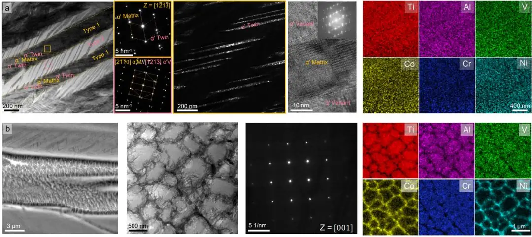 图 4. 显微组织表征。(a) α′相典型的透射电子显微镜(TEM)形貌及其能量色散 X 射线谱(EDS)化学成分分布。(b) 稳定 β 相的BSE 与 TEM 形貌及其化学成分分布。