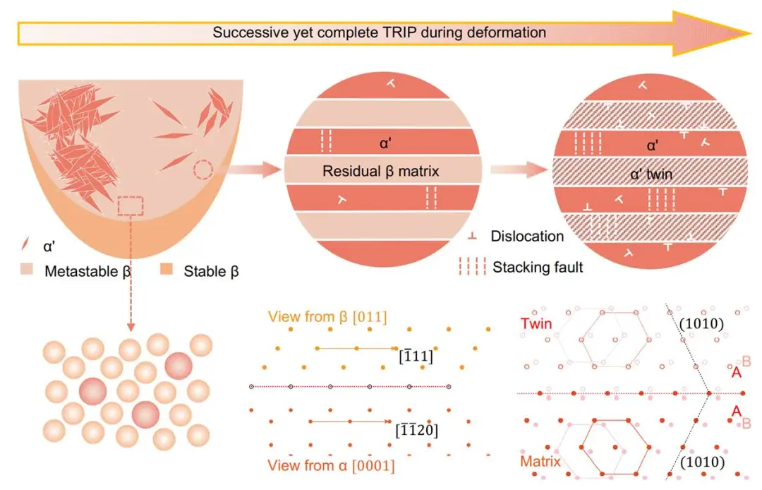 1️⃣早期变形中,亚稳 β 相转变为 α′马氏体,迅速提升加工硬化能力;