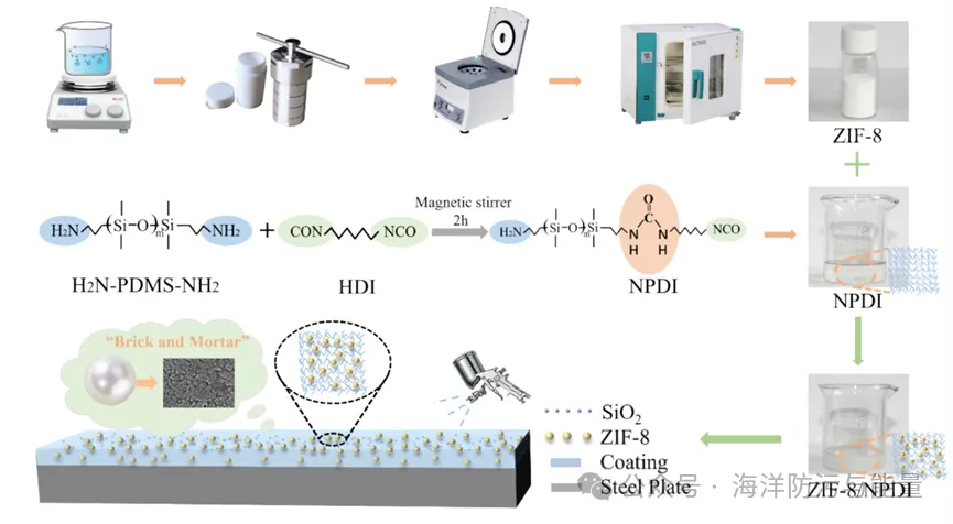 图1.ZIF-8@SiO2/NPDI防污涂料的合成流程。
