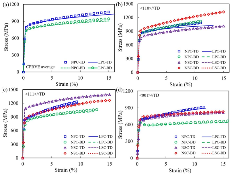 图7. 所有PC和SC模型的应力-应变曲线。(a) 整体LPC和NPC曲线。(b-d) 分别在TD和BD加载下,晶粒取向为(<110>/ / TD)、(<111>/ / TD)和(<001>/ / TD)地 LSC和NSC模型。这些对比量化了PC取向和微观结构效应对拉伸强度及其各向异性的贡献。