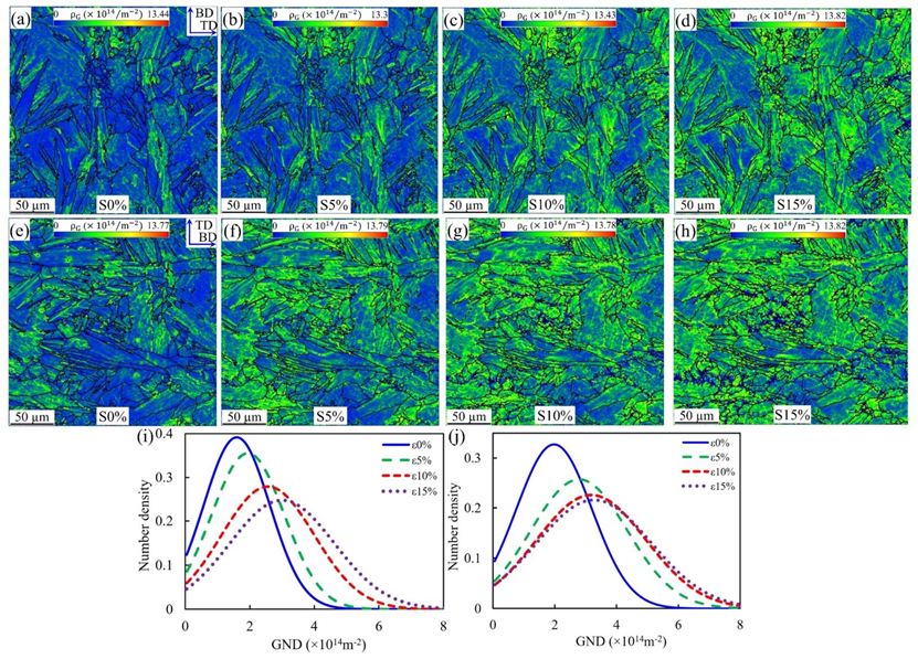 图3. 实验中GND密度演化。(a-d)S1在TD载荷作用下、应变分别为0%、5%、10%和15%时的原位GND分布。(e-h)S2在BD载荷作用下的相应数据。(i和j)S1和S2中GND的正态分布。