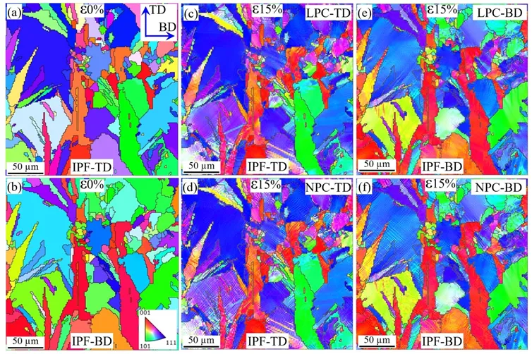 主要结论:本研究通过开发非局部位错的晶体塑性快速傅里叶变换(CPFFT)模型,并结合原位EBSD实验,深入探讨了LPBF加工的Inconel 718合金在不同加载方向(TD和BD)上的各向异性变形行为。结果表明,晶粒取向和纹理对材料力学性能具有重要影响,<111>//LD取向的晶粒在TD方向上表现出较强的屈服强度和硬化,而<110>//LD和<001>//LD晶粒具有较好的延展性。GND积累在TD方向的晶界和滑移带内显著增强了硬化效应,非局部CPFFT模型能够有效捕捉这些变形机制,准确预测应力-应变曲线和硬化效应,模拟结果与实验数据高度一致,为优化LPBF加工超合金的力学性能提供了理论依据。