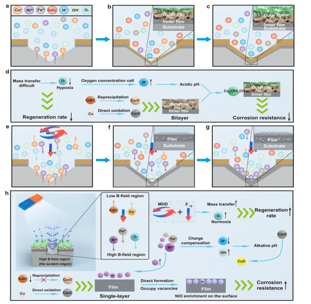 修复加速:扫描振动电极技术测试显示,在磁场作用下,划伤区域的电化学反应信号迅速减弱,9天后其电流密度甚至低于周围完好区域,表明再生膜的抗腐蚀性已优于原始完好膜层。结构优化:无磁场条件下,再生膜为常见的双层结构,外层是抗蚀性较差的碱式氯化铜,且覆盖不均。而在磁场下,再生膜形成了一层均匀、致密的单层结构。成分升级:磁场抑制了外层碱式氯化铜的沉积,同时显著促进了NiO在膜表面的富集。这种“表面富NiO的单层膜”结构此前从未被报道,正是其耐蚀性跃升的关键。