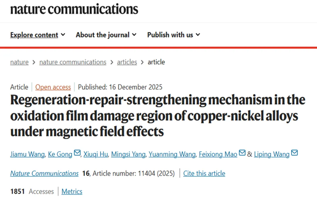 2025年12月,《自然·通讯》(Nature Communications)正式发表了中国科学院宁波材料技术与工程研究所海洋关键材料全国重点实验室王立平研究员团队的最新研究成果:《Regeneration-repair-strengthening mechanism in the oxidation film damage region of copper-nickel alloys under magnetic field effects》。该研究提出了一种通过磁场实现氧化膜损伤后快速修复的创新策略,成功突破了铜镍合金应用中长期存在的氧化膜损伤后难以修复的瓶颈,为解决海洋工程关键材料的延寿与防护提出了一种新的思路。