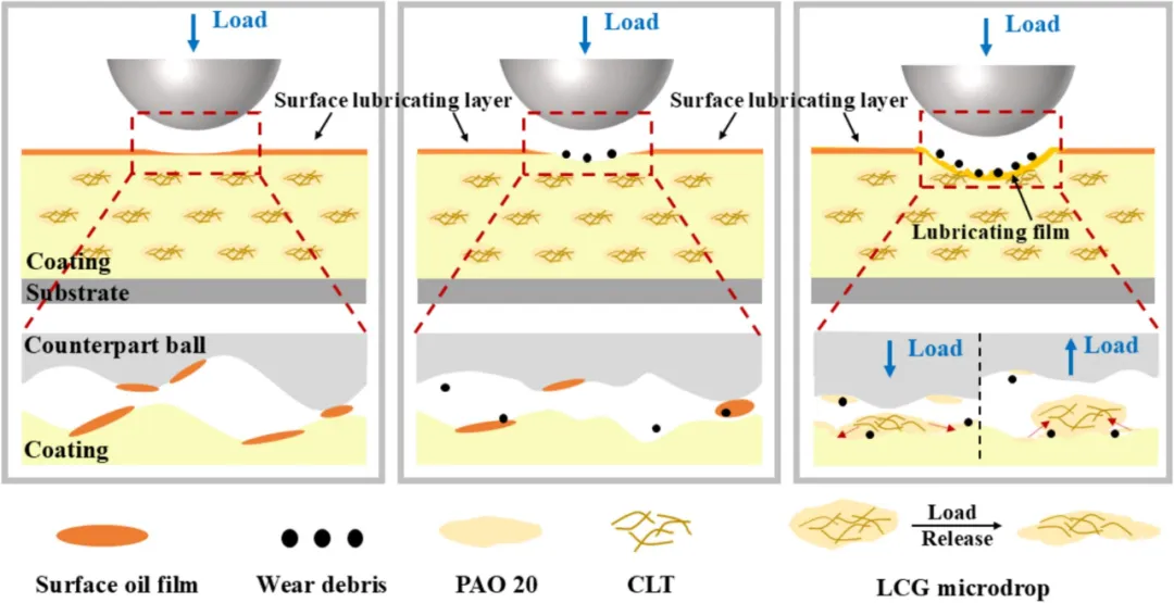 与固体填料相比,液体润滑剂具有更出色的润滑效率。然而,在树脂基质中实现液体润滑剂的均匀分散仍是一大挑战。微胶囊技术已被广泛用于将液体润滑剂融入树脂涂层中。在外部应力作用下,嵌入的微胶囊破裂并释放出封装的润滑剂。这种自润滑机制显著提高了涂层的摩擦学性能。然而,微胶囊的制备通常涉及复杂的工艺,并且重现性较差。此外,胶囊破裂后润滑剂会迅速耗尽。润滑脂是一种胶体润滑剂,能在增稠剂网络中保留润滑油。这种结构既提高了润滑效率,又增强了油留存能力。复合锂基润滑脂(LCG)易于制备,并具有优异的抗磨损性能和高机械稳定性。因此,将LCG直接且均匀地分散到树脂基质中,是开发自润滑涂层的一种有前景的策略。迄今为止,含润滑脂的树脂涂层研究较少,但这种方法有望提高整体性能。