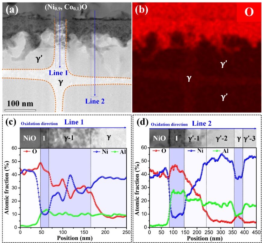 4. γ相就像氧气扩散的‘高速公路’(图6),它穿过形成的氧化层后,直接将氧输送到合金内部,促使第5层Al2O3层的提前形成。这种独特的时空形成机制,可能是此类合金具有优异抗氧化性的关键所在。