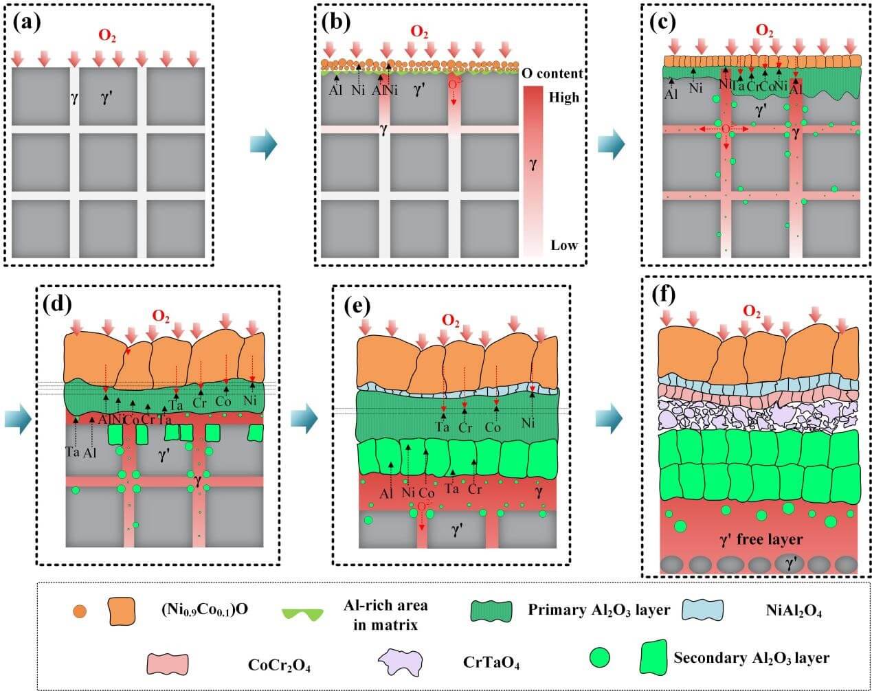 3. 中间层的转变(120秒至30分钟)(图5):位于表面的“初生”Al₂O₃层并非终点,它会随着时间推移,通过内部元素的扩散与反应,逐步分异和转化为最终的NiAl₂O₄(第2层)、CoCr₂O₄(第3层)和CrTaO₄(第4层)三层结构。