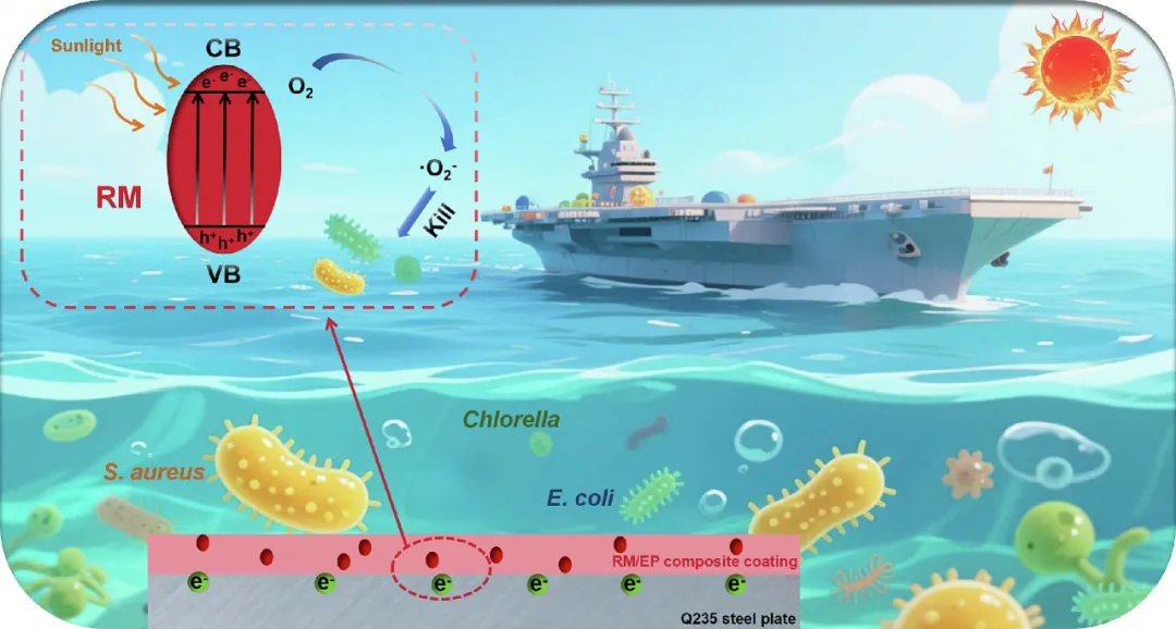 赤泥原料的初始处理包括在110℃下干燥2小时,随后通过175目筛网筛分,获得未改性材料,命名为RM。改性RM样品通过煅烧工艺制备:将3克RM置于坩埚中,在马弗炉中以5℃/min的升温速率加热至不同目标温度(250℃、350℃和450℃)。在目标温度下保持2小时后,样品自然冷却至室温。在不同温度下煅烧的RM样品分别命名为RM-X(X=250、350和450)。随后将改性RM材料单独加入环氧树脂(EP)中并均匀分散,确保RM与EP的质量比为1:200。接着向混合液中加入固化剂,使EP与固化剂的比例达到5:1。随后加入少量消泡剂和无水乙醇,将混合液在室温下搅拌15分钟制得涂层液。最后通过旋涂工艺(转速1600转/分钟)将预定体积的涂覆液涂覆于Q235钢表面,经25℃固化24小时后获得复合涂层体系,命名为RM/EP-X(X=250、350和450)。 所制得的复合涂层在模拟海洋环境中对Q235碳钢基材展现出卓越的综合防护性能。电化学阻抗谱(EIS)显示,RM/EP-350涂层在3.5 wt%氯化钠溶液中浸泡60天后仍保持优异的耐腐蚀性,阻抗半径高达2.69×106Ω·cm2。值得注意的是,该复合材料具有出色的抗生物污损能力,在光照条件下对大肠杆菌的抑制率达99.4%,对金黄色葡萄球菌的抑制率达99.6%,同时藻类附着极少。 本研究首次将RM作为功能性填料应用于防腐涂层,展现出卓越的耐腐蚀性和防污性能。 合成步骤示意图 RM/EP复合涂层合成步骤示意图。 防腐机制示意图 RM/EP复合涂层防污防腐机制示意图。 数据来源与出处 相关研究成果以“Utilization of red mud waste in epoxy resin composite coatings for corrosion and biological contamination resistance”为标题发表在《Chemical Engineering Science》上。