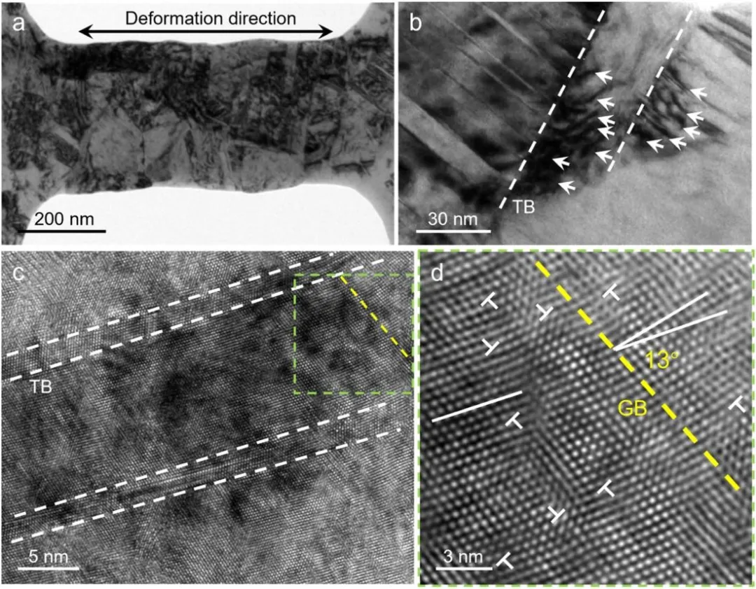 图1 NTNC HEA的微观结构表征。(a)XRD图谱证实了单相FCC结构。TKD IPF图谱从(b)样品的平面图和(c)样品的横截面图获得。(b)中的插图显示了相应的晶粒尺寸分布。(d)STEM-EDS元素图谱显示了合金的均匀化学成分。 图2 NTNC HEA的微观结构表征。(a)沿生长方向的沿着TEM图像,白色箭头指示样品生长方向。(b)样品的平面视图明场TEM图像。(c,d)平面视图取向的HRTEM图像。TB和SF用彩色虚线和白色箭头标记。(e)样品的截面明场TEM图像。(f)(e)中的选择区域的Magnetic HRTEM图像。 图3 NTNC HEA的机械性能。(a)来自沿着样品生长方向进行的微柱压缩试验的工程应力-应变曲线。插图SEM图像显示了微柱变形前后的结果。(b)应变硬化速率作为真实应变的函数,示出了由灰色虚线分隔的三个变形阶段:阶段I-由于剪切带形成而屈服后的急剧下降;第二阶段-硬化率上升后下降,归因于DRX诱导的晶粒细化和随后的去孪晶;阶段III-硬化速率接近于零,表明稳定的塑性流动由GB介导的等轴晶粒的变形和持续的去孪晶主导。(c)与其他合金的屈服强度和均匀应变的比较。NC和CG代表纳米晶和粗晶结构。 图4 NTNC HEA在不同压缩应变下的变形机制。(a-c)压缩至7%应变的微柱的TEM图像。(a)由白色箭头指示的剪切带的形成。(b)(a)中区域的磁共振图像。(c)显示柱状晶粒内位错的暗场TEM图像。压缩至13%应变的微柱的TEM图像:(d)剪切带附近新晶粒的形成,如蓝色箭头所示;(e)(d)中区域的磁共振图像,白色箭头突出显示新形成晶粒内的位错线;(f)剪切带附近的SAED图案。 图5 不同压缩应变下NTNC HEA的变形机制。压缩至20%应变的微柱的TEM图像:(a)在剪切带内观察到的显著动态DRX;(b)(a)的放大视图,显示具有约50nm的平均尺寸的DRX晶粒;(c)DRX晶粒内的高密度位错,如白色箭头所示;(d)选择用于HRTEM分析的DRX晶粒的双视场TEM图像,其中蓝色和绿色虚线框分别指示(e)和(f)中所示的区域:(f)Lomer-Cottrell位错锁的形成.压缩到30%应变的微柱的TEM图像:(g)在再结晶晶粒中发生GB畸变;(h)在DRX晶粒内观察到的位错线由白色箭头指示;(i)HRTEM图像和相应的FFT图案显示晶粒内不存在纳米孪晶。 图6 通过亚晶形成的位错介导的动态再结晶。(a)狗骨形拉伸试样的TEM图像,黑色双箭头指示拉伸方向。(b)变形诱导的TB处高密度位错阵列的累积,其中位错和TB由白色箭头和虚线标记。(c)HRTEM图像,显示了由与TB相邻的黄色虚线表示的亚晶界形成。(d)(c)的磁共振图像,清楚地显示出亚晶界处约13°的取向差。白色符号“Ʇ”表示位错。 图7 TB向常规GB的转变。(a)TEM图像,显示了在变形过程中晶粒内由白色虚线表示的弯曲TB。(b)界面区域的HRTEM图像,揭示了沿着同一边界的结构变化。(c,d)Magnetic HRTEM图像和(b)中右上区域的相应FFT图案。位错和TB分别用白色“Ʇ”符号和虚线标记。(e,f)来自(B)中左下区域的Magnetic HRTEM图像和FFT图案,显示了具有60°取向差的常规GB。(g)NTNC HEA的柱状晶粒在变形期间的DRX过程的示意图。 本文的研究成果如下: (1)通过磁控溅射技术制备出具有高密度预存纳米孪晶的纳米晶(NTNC)CrMnFeCoNi高熵合金,该合金呈现单相面心立方(FCC)结构,柱状晶粒平均尺寸约60nm,纳米孪晶与堆垛层错(SFs)在薄膜中均匀分布,平均孪晶宽度约3nm,且无元素在孪晶界面偏聚现象。 (2)微观柱体压缩实验显示,该合金屈服强度高达2.3GPa,压缩应变超过40%;拉伸实验中,标距段伸长量对应工程拉伸应变约31%,在屈服强度-均匀应变对比中,其性能显著优于众多传统纳米晶与粗晶材料,突破了纳米晶材料常见的强度-延展性权衡难题。 (3)明确室温变形时,剪切带内于约10%应变时激活动态再结晶(DRX),形成平均尺寸约50nm的等轴纳米晶粒。新生成的高角度晶界(HAGBs)可提高界面密度、阻碍位错运动,使流动应力提升至2.75GPa;同时,等轴晶粒的晶界能促进大应变下晶界介导的变形,配合去孪晶过程,有效抑制剪切局部化,实现稳定塑性流动,且应变硬化率呈现三阶段演变特征,分别与剪切带形成、DRX与去孪晶作用、晶界介导变形相关。 (4)通过拉伸实验揭示两种相互关联的纳米孪晶辅助动态再结晶(ntDRX)机制,一是位错在孪晶界(TBs)堆积,经位错重排形成亚晶界并演变为高角度晶界;二是共格孪晶界通过与位错相互作用直接转变为高角度晶界,且两种机制协同使DRX在较低应变(约13%)下即可启动,无需极高应变或高应变率条件。 (5)证实纳米孪晶在合金中兼具强化与促进DRX的双重功能,既通过阻碍位错运动、储存位错提升屈服强度与应变硬化能力,又作为位错堆积优先位点,为DRX提供有利形核条件,间接改善材料变形能力,为纳米晶高熵合金性能优化提供新的微观结构调控思路。