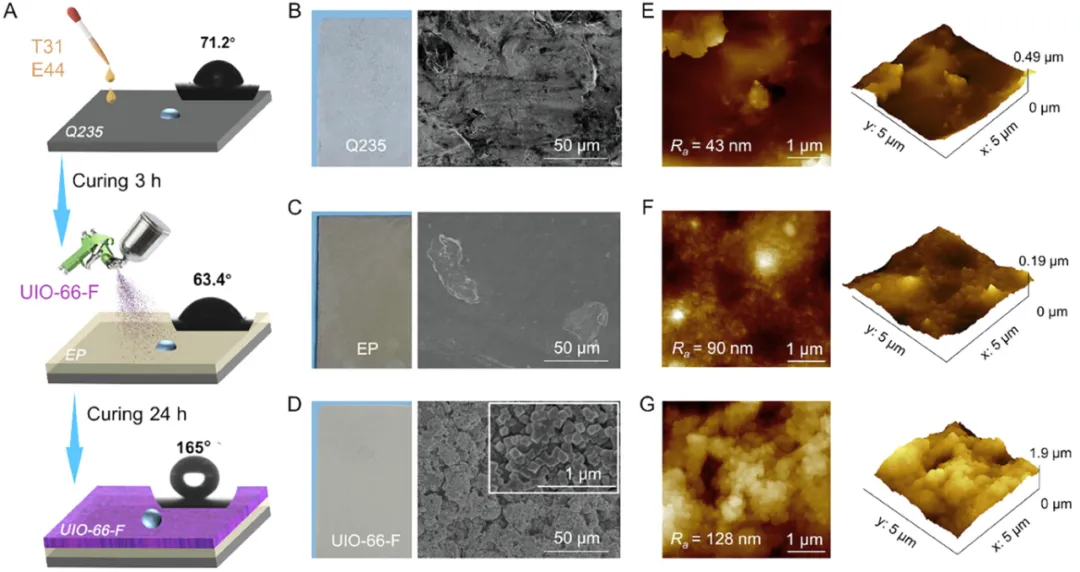 通过分子设计合成氟化UIO-66(UIO-66-F)纳米颗粒,然后通过多层喷涂工艺与环氧树脂(EP)相结合,制得UiO-66-F/EP复合涂层。 所制备的涂层在多种表面(包括Q235钢和陶瓷)上具有优异的附着力和基材普适性。该涂层表现出卓越的耐腐蚀性、显著的防冰能力、优异的自清洁性能和强大的机械强度。该涂层具有优异的超疏水性,水接触角为165°,并且在3.5wt% NaCl溶液中浸泡60天后仍能保持稳定的防护性能,其低频阻抗模量仍比未涂覆涂层的Q235钢高出约7个数量级。该涂层还具有优异的耐磨性和耐久性。此外,基于分子动力学模拟和表面能理论分析,从低表面能特性和微/纳米分级结构两方面系统阐述了其保护机理。 本研究为开发高性能防护涂层提供了理论见解和技术途径,在海洋工程、化工设施和基础设施等恶劣环境中展现出广阔的应用潜力,推动了超疏水涂层朝着多功能性和长期可靠性的方向发展。 合成过程 UIO-66-F纳米颗粒的合成过程与微观结构演变。 涂层制备示意图 (A)UIO-66-F/EP复合涂层制备过程的示意图;(B-D)Q235钢、EP涂层和UIO-66-F/EP复合涂层的数字照片(左)和SEM图像(右);(E-G)Q235 钢、EP涂层和UIO-66-F/EP复合涂层的AFM图像。 数据来源与出处 相关研究成果以“Superhydrophobic Coatings with Perfluorinated Metal–Organic Frameworks for Enhanced Corrosion Resistance”为标题发表在《small》上。