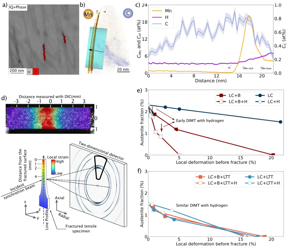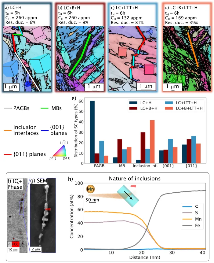 图1:本图展示了为钢中界面选择最合适溶质以防止氢偏聚的策略。图a比较了不同组织钢的氢脆指数与抗拉强度,突显了马氏体钢的高敏感性。图b示意了马氏体钢中氢致裂纹扩展的主要路径。图c是核心设计图,通过绘制溶质掺杂晶界的结合能与氢-掺杂晶界相互作用能的关系,筛选出能强化界面并排斥氢的最佳溶质(如硼和碳)。图d和图e则通过混合焓分析,评估了溶质与铁基体或碳形成沉淀相的倾向,进一步确定了硼和碳作为最适宜溶质。 02 图2:本图系统表征了添加硼和进行低温回火对低碳马氏体钢显微组织的影响。通过EBSD和同步辐射XRD分析,证明了硼的添加和回火处理对晶粒尺寸、晶界类型分布和位错密度影响有限。APT分析则定量揭示了硼在原奥氏体晶界以及碳在马氏体板条界上的偏聚。同步辐射结果还表明,低温回火通过碳的再分配和残余奥氏体体积分数的减少,实现了微观应力的弛豫。 03 图3:本图评估了不同处理工艺对材料抗氢脆性能和氢吸收量的影响。通过慢应变速率拉伸试验和热脱附光谱(TDS)测试发现,单独添加硼或进行低温回火均能提升残余延展性。而将二者结合(LC+B+LTT)则表现出显著的协同效应,使残余延展性始终保持在80%以上,同时将饱和氢含量降低至120 appm,表明通过界面偏聚和应力弛豫有效降低了氢的渗入。 04 图4:本图通过对氢充填后拉伸试样中二次裂纹的路径分析,揭示了硼和碳偏聚对改善抗氢脆性能的作用机制。分析表明,添加硼后,沿原奥氏体晶界开裂的比例大幅下降至10%以下,证明了硼对强化该类界面的有效性。在同时添加硼和回火的最佳条件下,裂纹更倾向于在马氏体板条界和夹杂物/基体界面处扩展,说明碳偏聚对马氏体界的保护作用为部分缓解而非完全阻止。 05 图5:本图探讨了残余奥氏体及其在变形过程中的稳定性对氢脆行为的影响。通过APT和EBSD证明了残余奥氏体以薄膜形式存在于马氏体板条界,并具有化学成分不均匀性。同步辐射XRD分析发现,氢的存在会诱发未回火钢中残余奥氏体在较低应变下发生形变诱导马氏体相变(DIMT),这被认为是氢脆的诱因之一。而经低温回火后,由于应力弛豫和可能的碳偏聚,残余奥氏体稳定性增强,未观察到氢诱导的早期DIMT,从而提升了抗氢脆性。