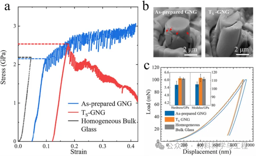 力学性能测试展示了界面状态对变形行为的决定性影响。初始状态下,疏松且成分不均的界面有利于剪切带形核,而坚硬的颗粒内部则阻碍其扩展,使其兼具高强度与良好塑性。当界面经历热致重排后,虽然塑性有所下降,但材料的屈服强度和硬度得到了显著提升。这证明,通过热处理调控界面状态,可以实现对该类非晶材料力学性能的调控。