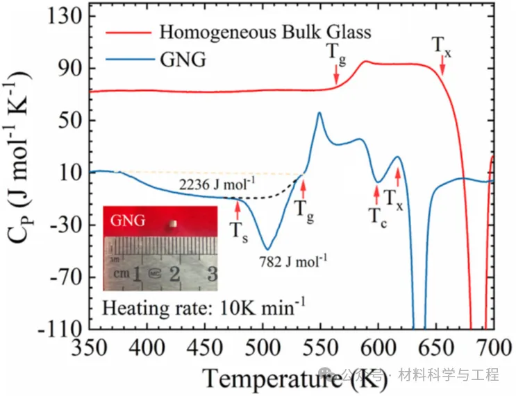 图1. 异常放热峰揭示界面相变。 DSC曲线显示,纳米结构金属玻璃在Tg以下出现一个尖锐的放热峰(TS峰),标志着界面特有的结构-成分重排。