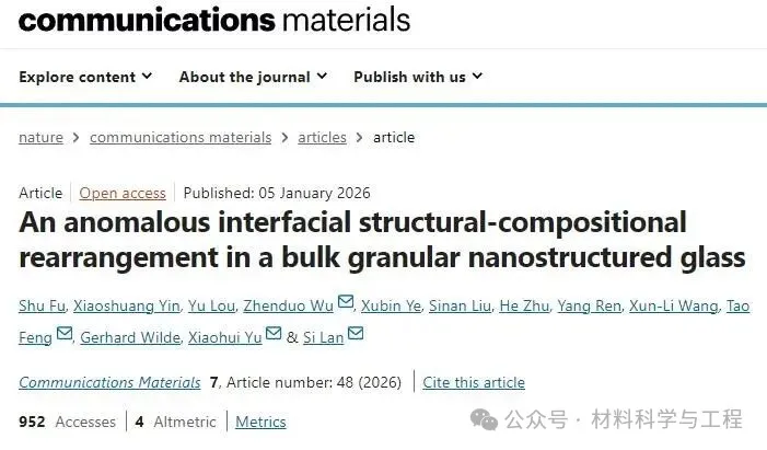 近日,南京理工大学兰司、冯涛教授团队联合北京凝聚态物理国家实验室于晓辉研究员,及香港城市大学(东莞)吴桢舵教授等,在Pd-Ni-P块体纳米结构金属玻璃中,通过三轴高压固结具有表面成分偏析的纳米颗粒前驱体,引入了大量成分/结构与体相不同的纳米非晶界面,并直接观测到非晶-非晶界面的结构-成分协同重排现象,证实该类界面在热力学上是一种亚稳相,并可通过热处理发生向体相结构的转变。该研究不仅深化了对非晶材料界面本质的理解,更为实现类似“晶界工程”的“非晶界面工程”提供了关键理论依据和实验范例。相关成果以 “An anomalous interfacial structural-compositional rearrangement in a bulk granular nanostructured glass” 为题,发表于期刊《Communications Materials》。
