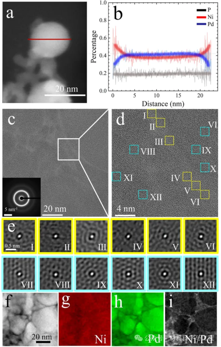 图2. 非晶-非晶界面的初始状态。 (a-d) 高分辨电镜证实纳米颗粒与界面的存在;(e) 自相关函数分析表明界面原子排列更无序;(f-i) 元素面分布图清晰显示Ni在界面偏聚,Pd在颗粒内部富集。