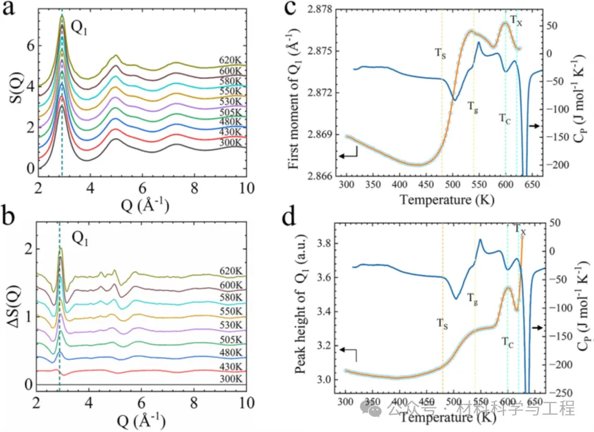 图4 & 5. 原位追踪相变过程。 原位X射线衍射数据实时捕捉到在TS温度附近,结构因子第一峰位置移动(致密化)及中程序峰强度增强(有序化)的过程。