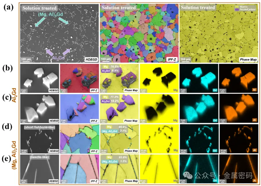 图4所示。铸态Mg-6Gd-1Al合金氧化前的EBSD分析(a)和第二相的高倍放大分析(b-e)。其中(b-c)为Al2Gd相,(d-e)为(Mg, Al)3Gd相。值得注意的是,(d)为花瓣状(Mg, Al)3Gd相,(e)为短鱼骨状(Mg, Al)3Gd相。