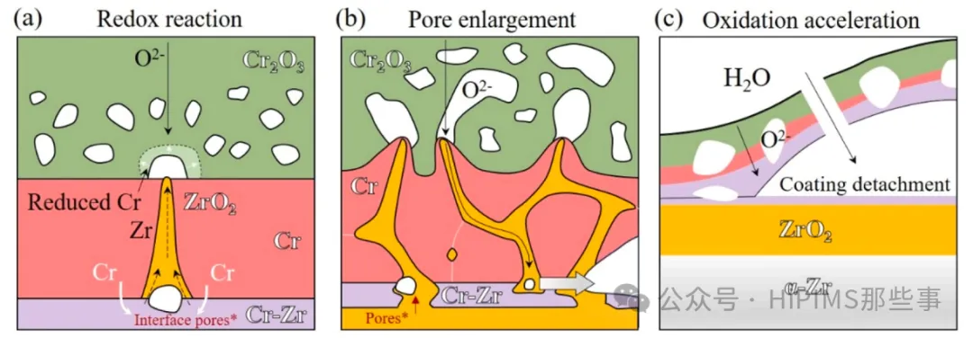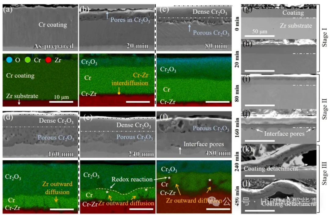 阶段II向阶段III的转变:由氧化还原反应和柯肯德尔效应诱导的更大尺度孔隙所驱动。Zr向外扩散并与Cr₂O₃发生反应(2Cr₂O₃ + 3Zr → 3ZrO₂ + 4Cr),该反应伴随体积收缩,加剧了界面孔隙的形成和扩大。同时,Cr/Zr互扩散过程中的柯肯德尔效应在界面处产生孔隙。这些孔隙的合并最终导致涂层局部鼓泡和剥离,使蒸汽更容易渗透至基体,引发氧化加速。