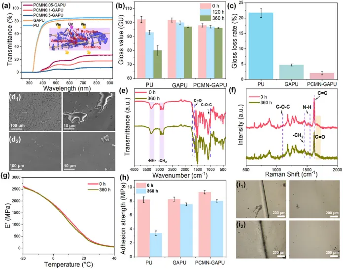 UV-vis透射光谱显示涂层可有效阻挡UVB和大部分UVA辐射,360 h加速UV老化后,光泽损失仅2.04%,远低于未改性的PU(21.72%)和GAPU(4.71%)。FTIR与Raman光谱证实了其化学结构的稳定性,DMA测试显示其储能模量几乎无衰减,附着力保持率达 92%,且老化后仍保留自修复能力。
