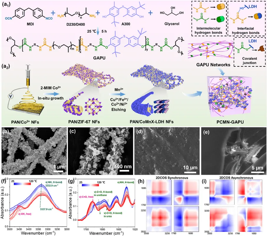 研究团队通过分子设计合成了GAPU基质(共价接枝抗氧化剂A300),并构建 PAN/CoMnNi-LDH纳米纤维增强相,SEM图像显示0.1 wt%纳米纤维添加量使涂层呈现致密均匀结构,界面氢键形成“铆钉状”锚定位点。变温FT-IR与二维相关光谱显示,基质与纳米纤维间存在具有不同热稳定性的分子内和界面氢键网络,为功能协同提供结构支撑。