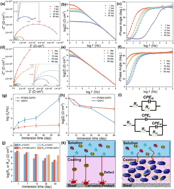 图 7. PCMN-GAPU长效防腐性能与防护机制