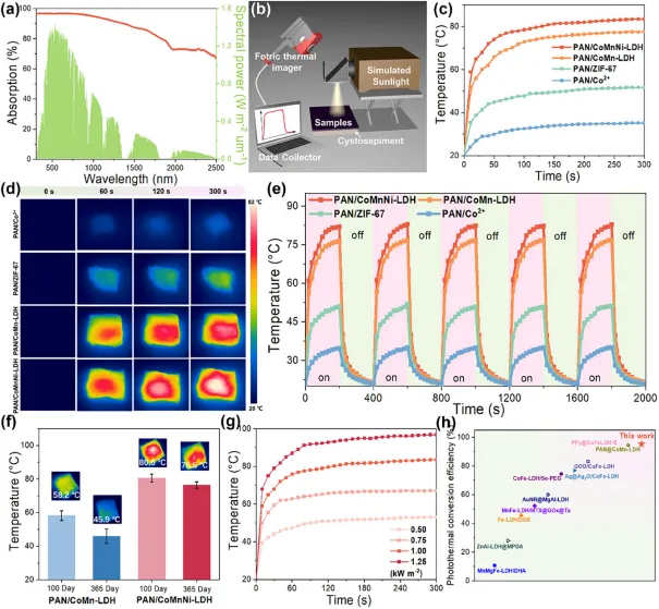 UV-vis-NIR光谱显示PAN/CoMnNi-LDH在200-2500 nm范围平均吸收率达95%(紫外-可见区)和75%(红外区),模拟太阳光照射下300 s内温度升高至83.5 °C,光热转换效率达95.24%。经过365天储存和多次光开关循环,其光热性能无明显衰减,且显著优于二元 CoMn-LDH。