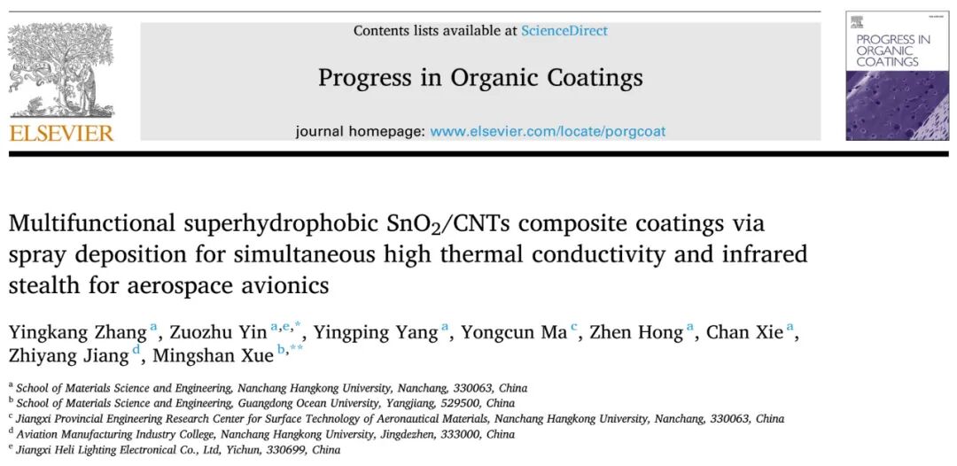 近期,南昌航空大学殷祚炷团队、广东海洋大学薛名山团队通过喷涂法,在铝基材上成功制备了一种具有高热导率和红外隐身性能的超疏水复合涂层。