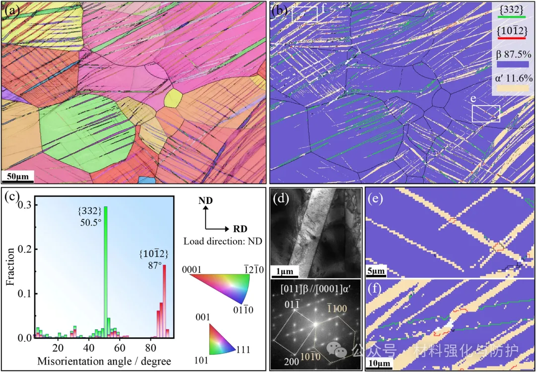 变形后合金中存在大量SIMα'带和{332}孪生带,其中SIMα'面积分数高达11.6%,这些带作为障碍物,在与SIMα'或{332}孪生相遇时,会发生相互作用,并最终触发二次{1012}孪生。