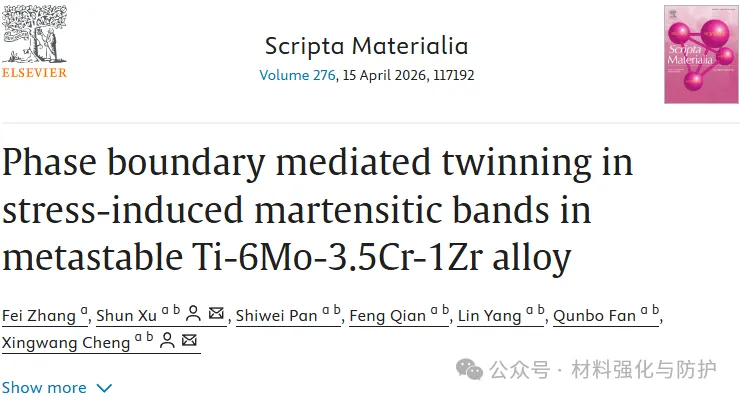 北京理工大学的徐舜教授和程兴旺教授作为通讯作者,于2026年1月28日在材料领域的国际期刊《Scripta Materialia》上在线发表了题为“Phase boundary mediated twinning in stress-induced martensitic bands in metastable Ti-6Mo-3.5Cr-1Zr alloy”的研究论文。在本论文中,团队阐述了在Ti-6Mo-3.5Cr-1Zr合金中发现的相界处几何错位最小化在孪生变体选择中的关键作用,直接变现体现为应力诱导马氏体带与残余α'相界相互作用时,会触发二次{1012}孪生作为协调机制,并且优先选择沿<1120>方向与相界相交的变体。