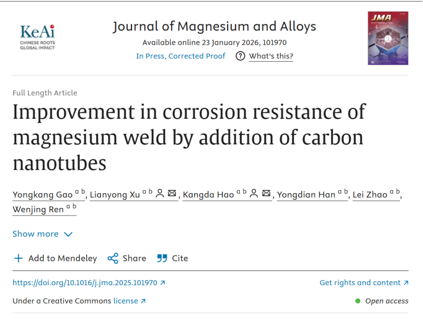 该项研究成果以“Improvement in corrosion resistance of magnesium weld by addition of carbon nanotubes”为题,在线发表于国际材料期刊《Journal of Magnesium and Alloys》。天津大学徐连勇教授、郝康达副教授为该论文通讯作者。该研究工作获得国家自然科学基金(52275364、52025052)的资助。