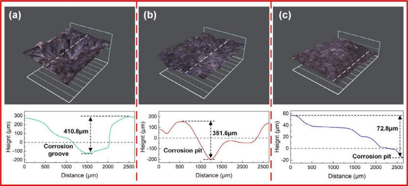 图10 样品浸泡72小时后的3D图和相应的腐蚀深度图。