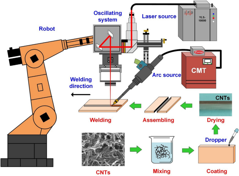 将纳米材料引入焊接工艺,为解决上述问题提供了一种极具前景的前沿策略。常用的纳米材料包括TiC、B4C、Al2O3等纳米颗粒,以及碳化硅晶须、碳纳米管(CNTs)等纳米纤维。其中,碳纳米管因高长径比、优异导电性及卓越的力学性能而备受关注。大量研究证实,碳纳米管可显著提升复合材料的力学性能与功能特性。Shi等人制备了碳纳米管增强镁基复合材料,发现晶粒细化效应与碳纳米管的拔出效应共同改善了材料的塑性。Abazari等人的研究显示,向AZ31镁合金中添加碳纳米管后,合金晶粒尺寸细化了61%,抗压强度与硬度分别提升了36%与37%。Omid Ekhlasiosgouei等人发现,碳纳米管的均匀分布可增强复合材料的耐蚀性;但随着碳纳米管含量增加,其与基体之间会形成微电偶对,反而加速腐蚀进程。这一结论表明,碳纳米管虽优势显著,但其添加量必须严格控制,以避免对材料耐蚀性产生负面影响。