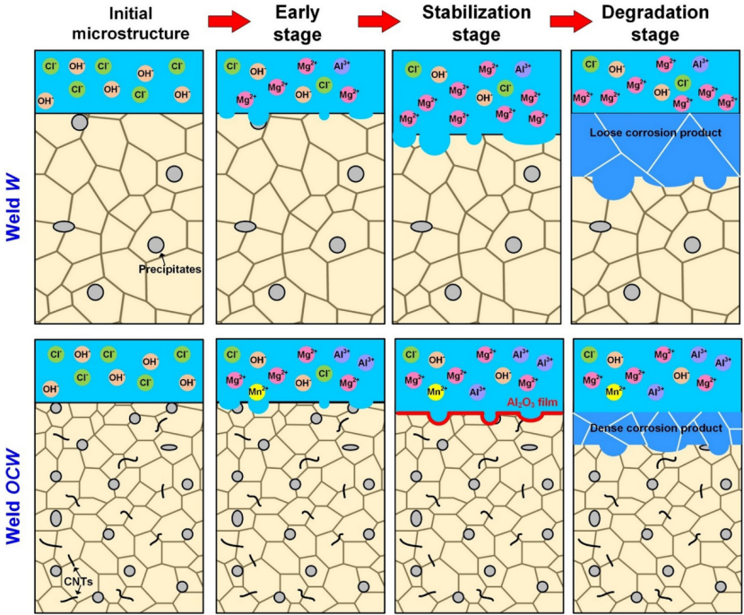 背景:镁合金具有低密度、高比强度及优良的阻尼性能,是航空航天、通信及生物医药领域不可或缺的关键材料。然而,由于其固有的活性化学性质,在腐蚀性环境中容易腐蚀,严重阻碍了其广泛应用。此外,这种腐蚀敏感性在镁合金焊缝处表现得尤为突出。焊接过程中,快速且复杂的热循环会使焊缝形成非平衡组织,同时产生残余应力与冶金缺陷,这些因素均会成为优先腐蚀位点,进而进一步降低焊缝的耐蚀性。
