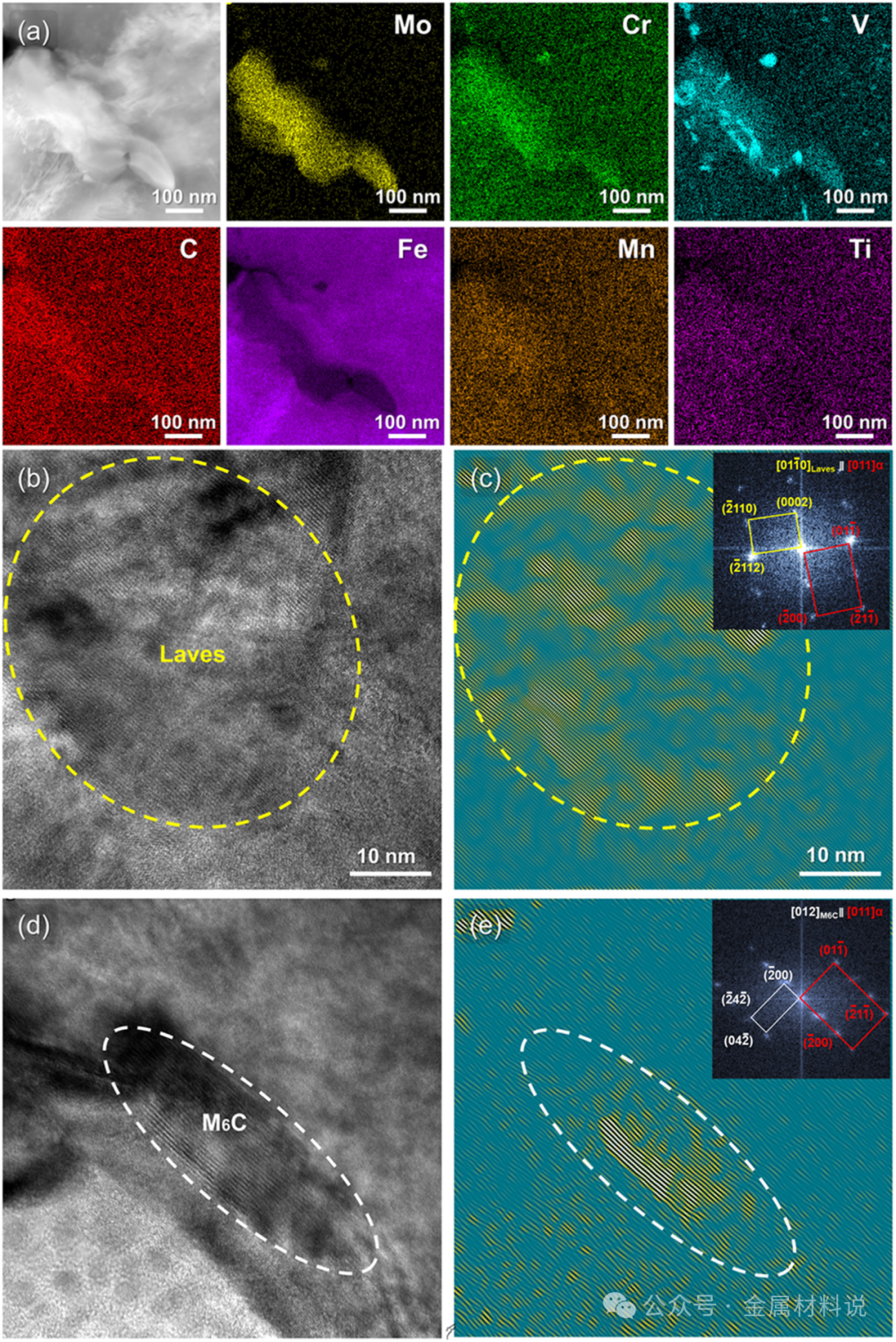 本文针对火力发电厂中广泛使用的20Cr1Mo1VTiB高温螺栓钢,在长期高温(约540℃)实际服役约1.30×10⁵小时后,系统研究了其微观组织演变与脆化机制。研究采用扫描电镜、电子背散射衍射、透射电镜和高分辨透射电镜等多种表征手段,结合热力学计算,揭示了服役过程中显微组织的显著变化:贝氏体板条粗化、位错密度降低、高角度晶界比例增加,以及沿晶界连续析出的M₆C碳化物和Laves相。这些析出相与基体形成非共格界面,产生严重的局部应力集中,并削弱晶界结合力。力学性能测试表明,长期服役导致屈服强度和抗拉强度分别从809 MPa和890 MPa下降至720 MPa和833 MPa,冲击韧性更是从132 J急剧降至34 J,断裂模式由韧性转变为脆性。研究明确了由M₂C向M₆C碳化物的转变序列及Laves相的协同析出行为,并从强化机制退化和脆性断裂路径形成两方面,阐释了性能劣化的微观机理,为评估该类高温紧固件的服役寿命及材料优化提供了重要的理论与实验依据。 部分内容解读 01 图1展示了20Cr1Mo1VTiB钢在服役前后的室温拉伸与冲击性能对比。拉伸曲线显示服役后试样屈服与抗拉强度下降,且应变硬化行为从三阶段变为两阶段。冲击载荷-位移曲线则清晰表明,服役后试样的裂纹稳定扩展阶段几乎消失,冲击吸收能量从132 J骤降至34 J,直观反映了材料服役后严重的脆化倾向。 02 图3通过SEM和TEM图像对比了服役前后析出物的形貌与分布。服役前,析出物数量较少且孤立分布在晶界;服役后,晶界处出现大量直径约40 nm的细小球状析出物,并聚集形成近乎连续的链状析出簇,TEM图像进一步证实了这种沿晶界的纳米级连续析出网络。 03 图5利用HAADF-STEM和HRTEM对服役样品中的析出相进行了精细表征。结果表明存在两种主要析出相:富含Mo、直径约93 nm的Laves相(C14结构)和富含V、直径约31 nm的M₆C型碳化物。两者在晶界相邻分布,EDS面扫描显示了清晰的元素偏聚,HRTEM与FFT分析确定了它们的晶体结构及与基体间较大的晶格失配度。 04 图7对比了服役前后试样的冲击断口形貌。服役前断口呈现明显的塑性变形特征,包括深韧窝和大量的二次裂纹;服役后断口则变得平坦,韧窝浅而大,二次裂纹减少,并以解理面和沿晶断裂特征为主,宏观和微观上均证实了断裂模式从韧性向脆性的转变。 05 图11通过EBSD技术分析了冲击断裂后裂纹扩展区域的晶界特征和局域取向差。结果表明,服役后试样中的主裂纹更加平直,偏折角度减小,更易于沿低阻力路径扩展;同时,KAM图显示服役试样裂纹尖端的局部塑性变形程度显著降低,表明析出相严重损害了材料的应变协调与裂纹尖端钝化能力。