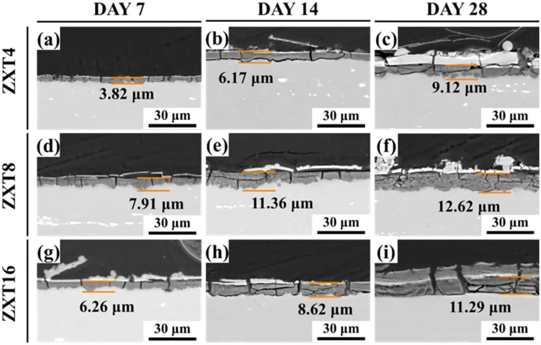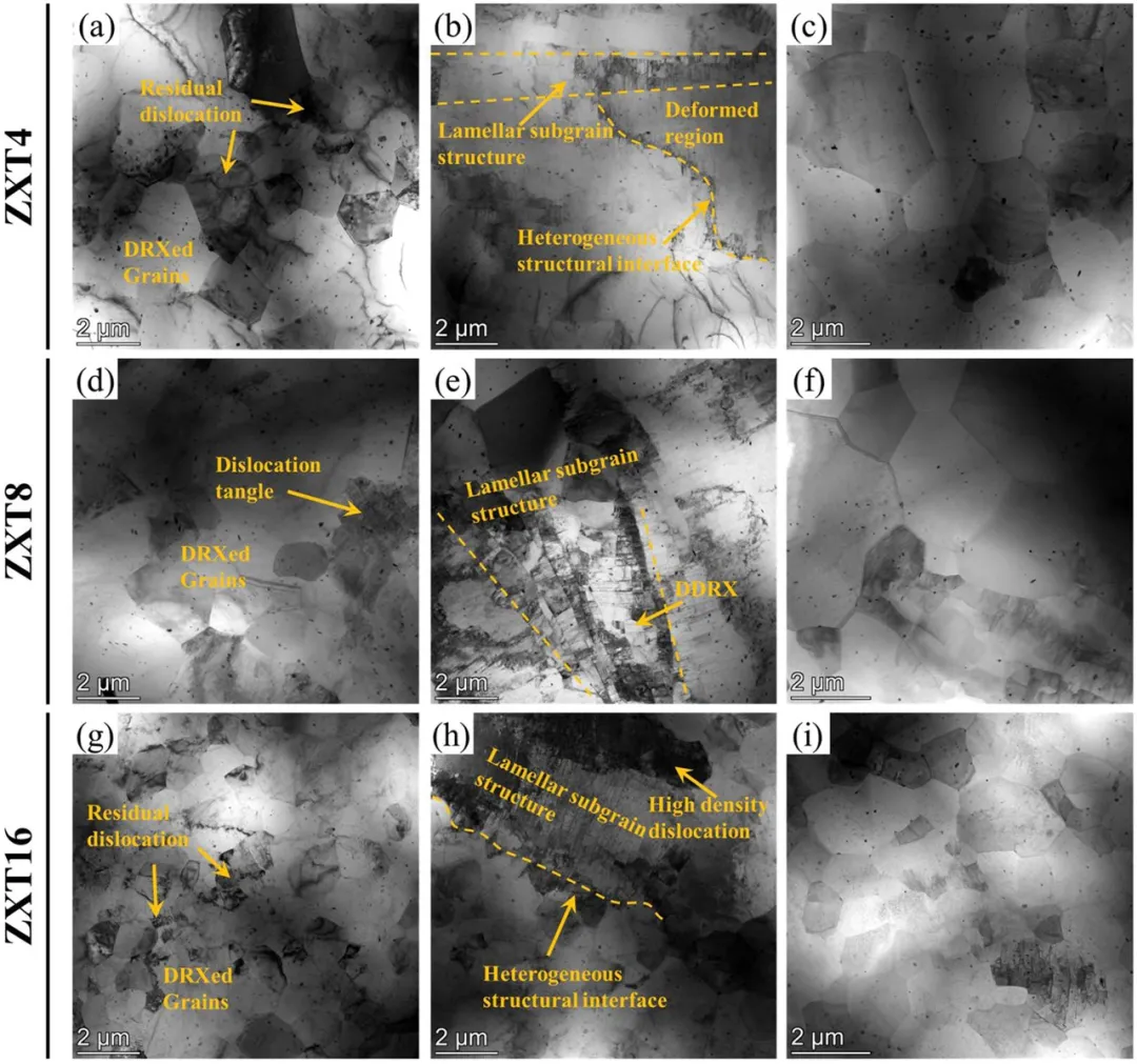 详细解读 01 图1通过电子背散射衍射(EBSD)的逆极图(IPF)和动态再结晶(DRX)晶粒尺寸分布图,展示了ZXT系列合金沿挤压方向的微观结构。所有合金均呈现由细小DRX晶粒包围变形晶粒组成的异质纤维状结构。统计结果表明,随着Sn/Ca原子比从1:4(ZXT4)降低至1:16(ZXT16),DRX晶粒的平均等效直径从3.01 μm减小到2.15 μm,而ZXT8的晶粒最粗(3.75 μm)。DRX面积分数则先增后减,ZXT8最高(55.6%)。这些差异与后续析出相的钉扎效应密切相关。 02 图5通过透射电子显微镜(TEM)分析了不同Sn/Ca原子比合金的微观结构演变。低倍明场像显示合金主要由DRX晶粒和残留的位错网络组成。未再结晶区域呈现高位错密度的层状亚结构,表明连续动态再结晶(CDRX)机制活跃。在高角度环形暗场扫描透射电子显微镜(HAADF-STEM)下观察到纳米析出相,其密度在ZXT8合金中最低,这解释了ZXT8合金再结晶驱动力较弱和DRX晶粒较粗大的原因。位错在DRX晶粒与变形晶粒界面处塞积,导致了异质变形诱导(HDI)强化。 03 图7通过高分辨率HAADF-STEM成像、EDS面扫描及选区电子衍射(SAED)对ZXT4合金中的纳米析出相进行了精细表征。EDS分析结合SAED花样鉴定出富Sn的析出相为CaMgSn金属间化合物,其与α-Mg基体存在[2-2 0 1]α-Mg // [0 -1 0]CaMgSn的晶体学取向关系。富Zn的析出相被确定为Ca2Mg6Zn3,这是Mg-Zn-Ca系合金中的典型相。这些纳米析出相对位错运动有钉扎作用,贡献了Orowan强化。 04 图8通过HAADF-STEM、高分辨TEM(HRTEM)和SAED对ZXT16合金中的富Ca相进行了表征。EDS面扫描显示该相富含Mg和Ca元素。HRTEM图像和相应的SAED花样共同证实该析出相为Mg2Ca。这些Mg2Ca析出相尺寸在45-150纳米之间,并倾向于沿晶界分布,有效阻碍了晶界迁移,从而促进了再结晶晶粒的细化。 05 图12展示了ZXT系列合金在Hank's溶液(37±0.5°C)中浸泡不同时间后的腐蚀产物膜截面形貌。经过7天浸泡后,所有合金均呈现均匀腐蚀特征。截面分析表明腐蚀产物膜具有双层结构:内层为复合氢氧化物/氧化物,外层为含吸附成核位点的磷酸钙沉积层。定量测量显示,在整个浸泡过程中,性能最优的ZXT4合金的腐蚀产物膜层最薄(约9.12 μm),而ZXT8和ZXT16的膜层较厚(分别约12.62 μm和11.29 μm),这与ZXT4合金最佳的耐腐蚀性相一致。