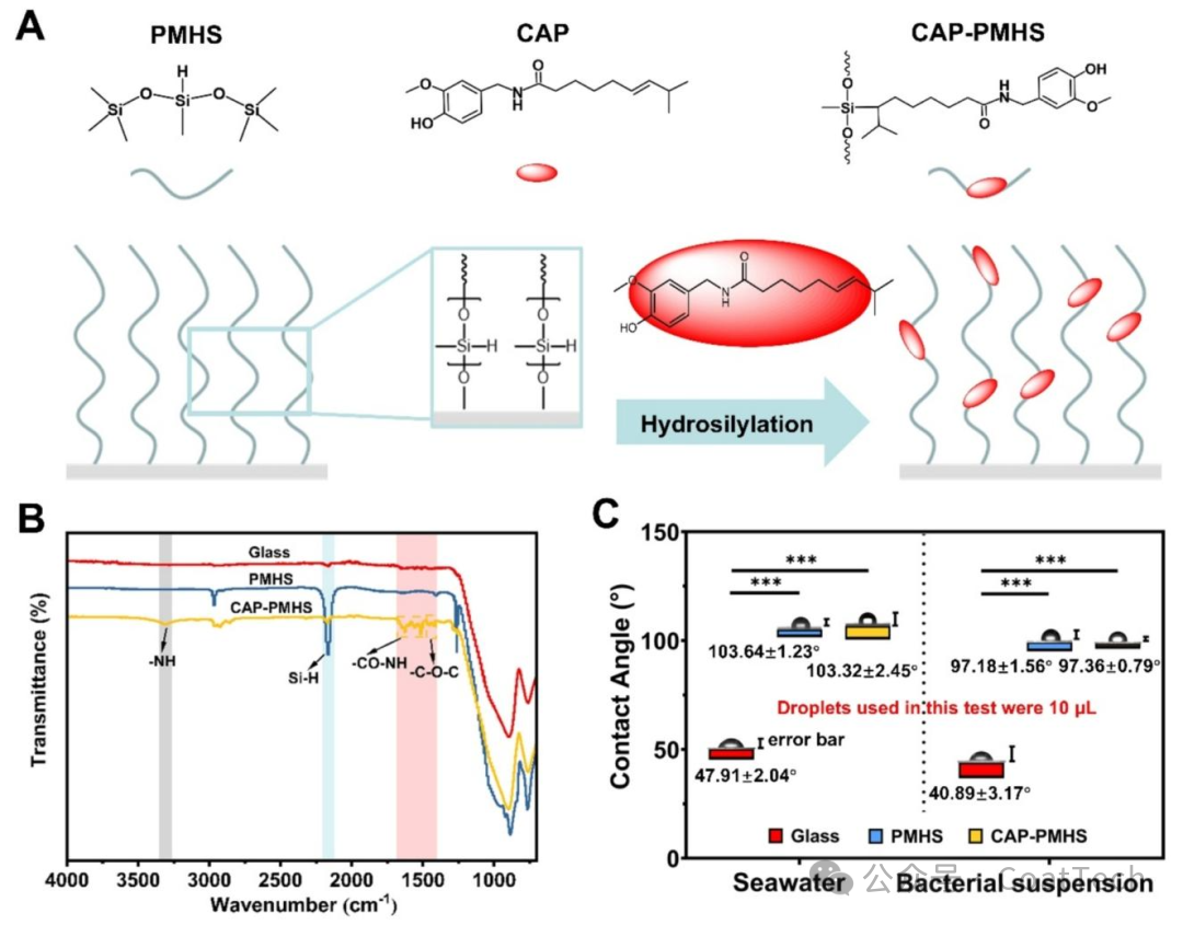 Chemical Enginnering Journal 近日,中国科学院海洋研究所的研究团队在国际知名期刊《Chemical Engineering Journal》发表最新成果,研发出一款基于辣椒素改性的CAP–PMHS 类液体防污涂层,通过干扰污损生物的表面运动和感知系统,实现了对微、宏污损生物的跨物种非致死防污,兼具优异的理化性能和环境友好性,为海洋防污技术开辟了新方向。 这款新型涂层的制备工艺简洁高效:研究团队以聚甲基氢硅氧烷(PMHS)为基底,通过一步硅氢化反应,将天然辣椒素(CAP)接枝到 PMHS 表面,成功制备出 CAP–PMHS 类液体涂层,全程无需复杂条件,易规模化生产。 经一系列表征测试,该涂层的理化性能表现亮眼:✅ 强疏水性:海水接触角达 103.32°±2.45°,细菌悬液接触角 97.36°±0.79°,水滴可轻松滑落,大幅减少生物初始粘附;✅ 超耐用性:100 次胶带剥离后接触角变化不足 2°,海水长期浸泡、砂纸磨损后性能依旧稳定,基底结合牢固;✅ 高透明性:300-800 nm 波段光学透明性与玻璃基底相当,可应用于海洋光学传感器、观测窗口等特殊场景;✅ 无释放环保:辣椒素通过共价键接枝牢固,无溶出性抗菌成分,避免对海洋环境造成二次污染。 图1:CAP–PMHS 涂层的快速制备 不同于传统 “毒杀式” 防污,这款涂层主打行为调控式防污,针对微、宏污损生物的不同特性,实现了精准且高效的抑制,实测效果令人惊艳。 研究以铜绿假单胞菌(海洋常见腐蚀性微生物)为微污损生物模型,发现 CAP–PMHS 涂层在10 分钟内即可使细菌初始粘附减少 96.3±0.4%,5 天动态培养后,生物膜生物量较纯 PMHS 涂层降低 98.6%,对硅藻等其他微生物也有广谱抑制效果。 其核心机制在于涂层能破坏细菌的化学感应系统和代谢通路:一方面显著抑制细菌的游动、群集、蹭行等运动能力,让细菌难以在表面定殖;另一方面干扰细菌的群体感应信号,减少毒力因子分泌,同时诱导胞内活性氧积累,使细菌无法形成成熟的生物膜,且脱离涂层后细菌可恢复正常增殖,真正实现 “非致死抑制”。 图2:辣椒素接枝涂层对细菌初始粘附及生物膜形成的影响 图3:辣椒素接枝对细菌运动能力及生长的影响 图4:细菌在聚甲基氢硅氧烷(PMHS)及 CAP–PMHS 表面的基因表达情况 以太平洋牡蛎幼体(典型海洋宏污损生物)为研究对象,涂层展现出极强的附着抑制效果:24 小时培养后,牡蛎幼体在涂层表面的附着密度仅为玻璃表面的 15%,附着抑制率达 85%,且幼体死亡率与空白组无显著差异,证明涂层仅抑制附着行为,不影响生物生存。 研究团队通过分子生物学手段进一步探明,涂层的作用靶点是牡蛎幼体足部高表达的 TRPM8 钙离子通道—— 这是幼体感知基底、触发附着的关键通道。辣椒素改性的涂层会干扰该通道的表达,阻断 Ca²⁺介导的附着信号传导,让牡蛎幼体在接触涂层后产生 “避害反应”,主动向涂层外的区域迁移,从行为上拒绝附着。 图5:辣椒素对牡蛎面盘幼虫运动及附着行为的影响 图6:TRPM8 通道参与调控太平洋牡蛎幼虫的附着过程 为验证涂层的实际应用效果,研究团队在西海岸公园码头开展了15 天海洋现场挂板测试。结果显示,CAP–PMHS 涂层表面始终保持完整,无明显水螅、藻类、贝类幼体等污损生物粘附;而对照组的 Q235 裸钢表面则污损严重,充分证明了这款涂层在实际海洋环境中的优异防污性能。 图7:钢试片在海洋环境中暴露 15 天后的宏观照片:(a1-a2)裸钢和(b1-b2)CAP–PMHS 涂层样品。 一段话总结:本研究通过一步硅氢化反应将天然辣椒素(CAP)接枝到聚甲基氢硅氧烷(PMHS)表面,制备出CAP–PMHS 类液体防污涂层,该涂层具备优异的疏水性、机械耐久性和光学透明性,10 分钟内可使铜绿假单胞菌粘附减少96.3 ± 0.4%,对太平洋牡蛎幼体附着的抑制率达约85%;其防污机制为从分子层面干扰污损生物的感知和运动系统,对铜绿假单胞菌破坏其化学感应与代谢通路、抑制运动能力,对牡蛎幼体则靶向其足部高表达的TRPM8 通道阻断幼体附着信号,且该涂层为无释放型、环境友好型,经海洋现场测试验证了优异防污效果,为跨物种非致死性防污材料研发奠定了理论和实验基础。 文章总体思维导图 文章链接:https://doi.org/10.1016/j.cej.2026.173605一种类液体涂层通过干扰污损生物的表面运动能力抑制海洋生物污损